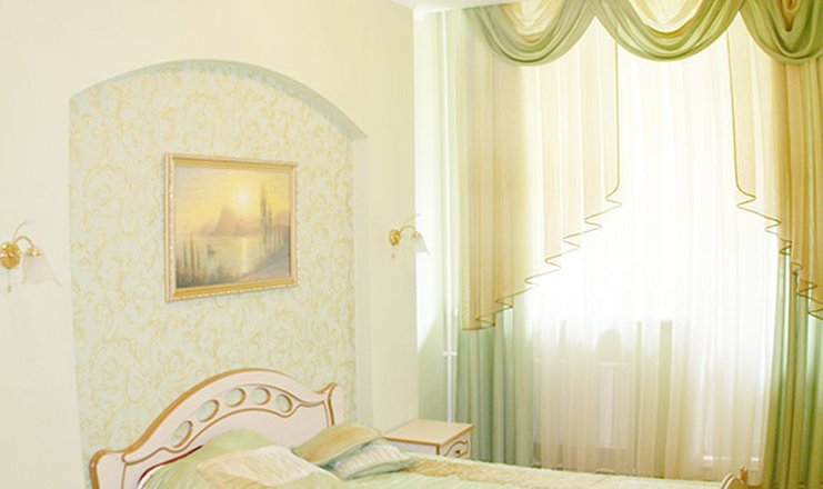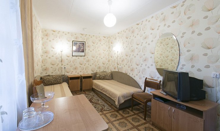 В номере: две комнаты: спальня и гостиная, кровать двуспальная, прикроватная тумбочка, стол, стул, шкаф, набор мягкой мебели, мини-кухня, телевизор, холодильник, чайный набор посуды, электрочайник, микроволновая печь