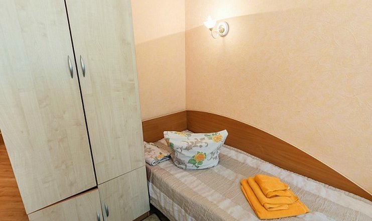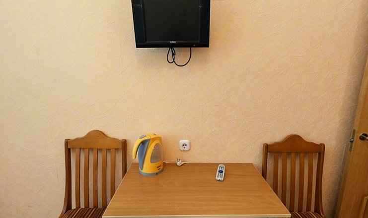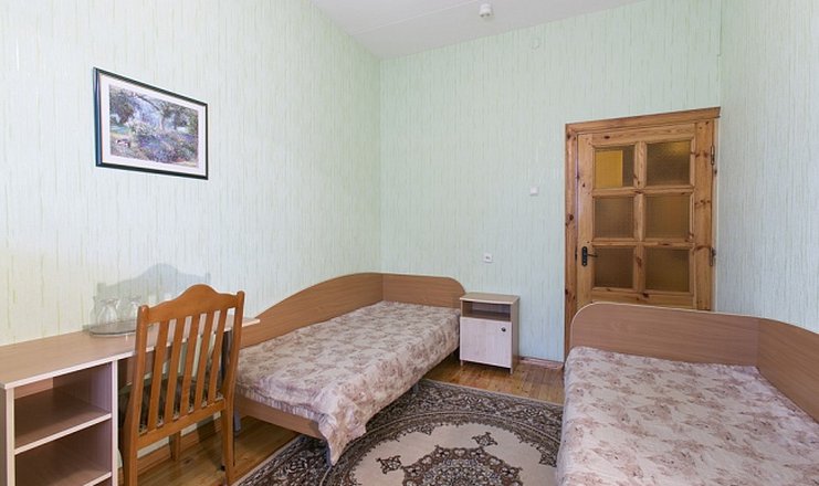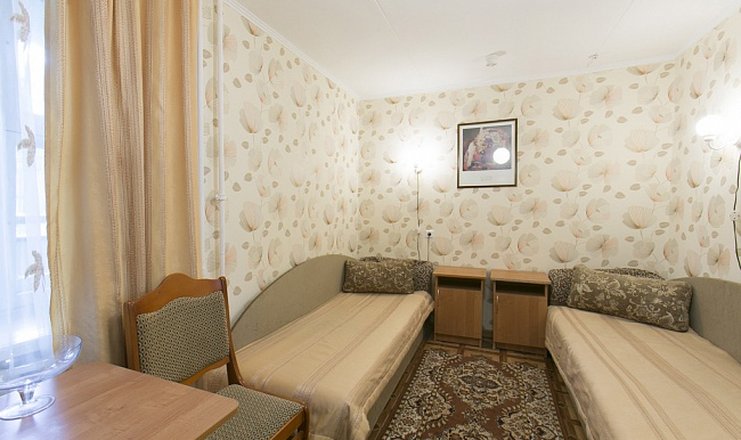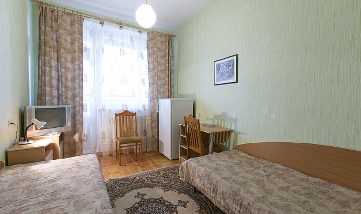 В номере:две односпальные кровати, прикроватные тумбочки, стол, стул, шкаф, телевизор, холодильник, чайный набор посуды, электрочайник