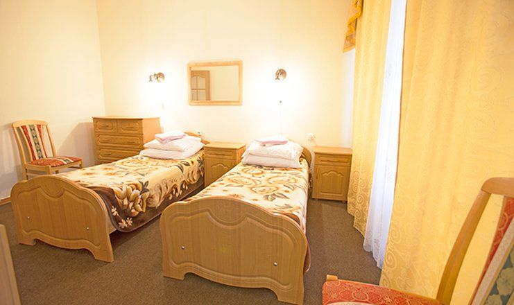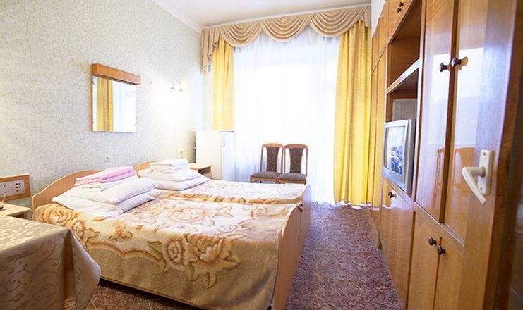 Оснащение номера: две односпальные кровати, прикроватные тумбочки, стулья, стол, шкаф для одежды, телевизор, телефон, холодильник, электрический чайник