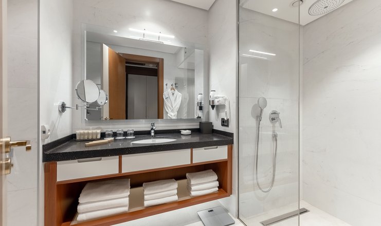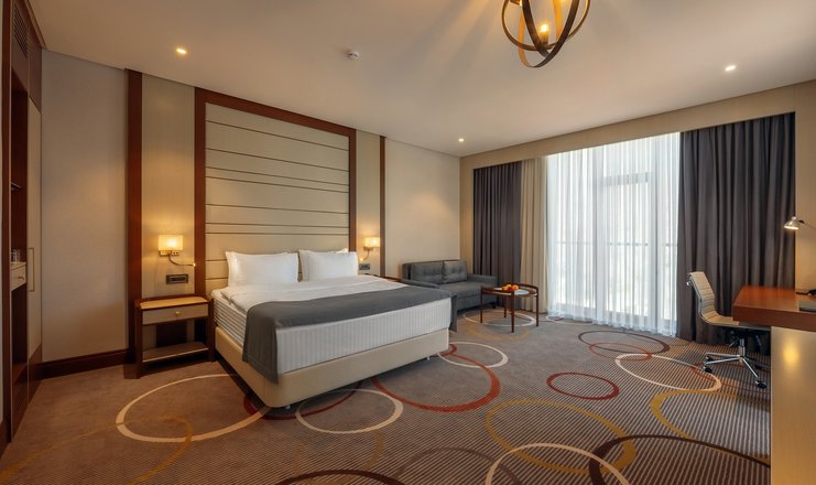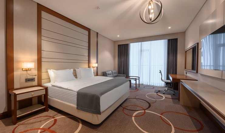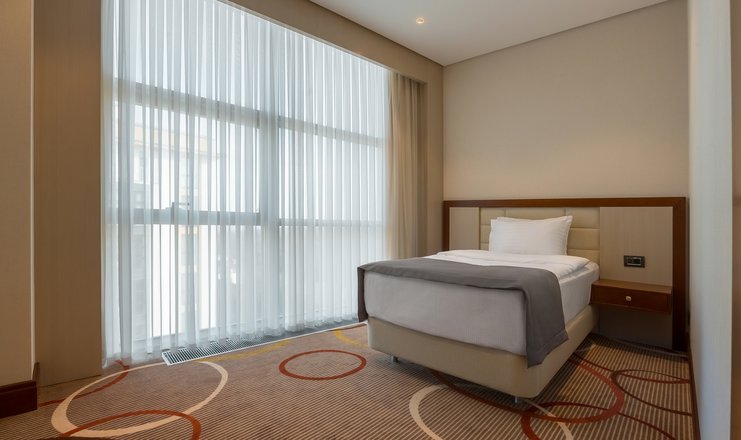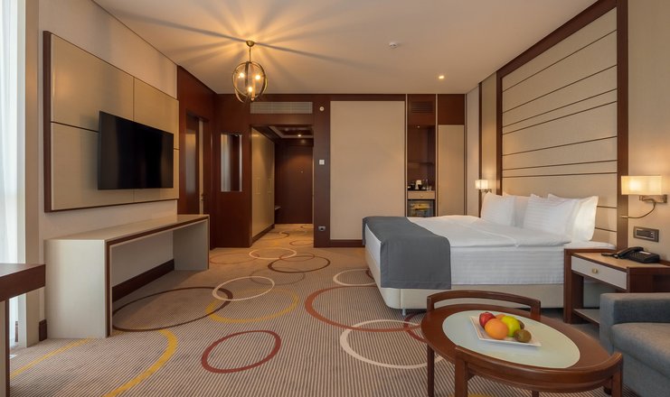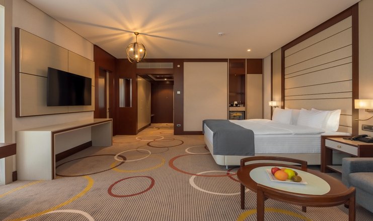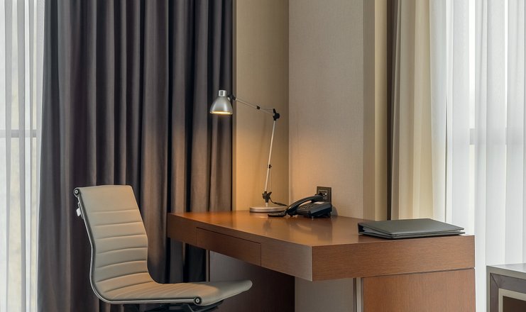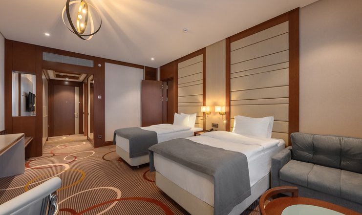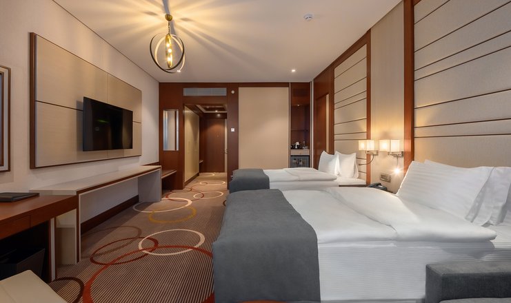 В номере: кровати односпальные /одна двуспальная кровать, прикроватные тумбочки, стол письменный, стул, шкаф, кресло-кровать или кровать (доп.место), мини-холодильник, сейф, сплит-система, телевизор ЖК, чайный набор посуды, электрочайник