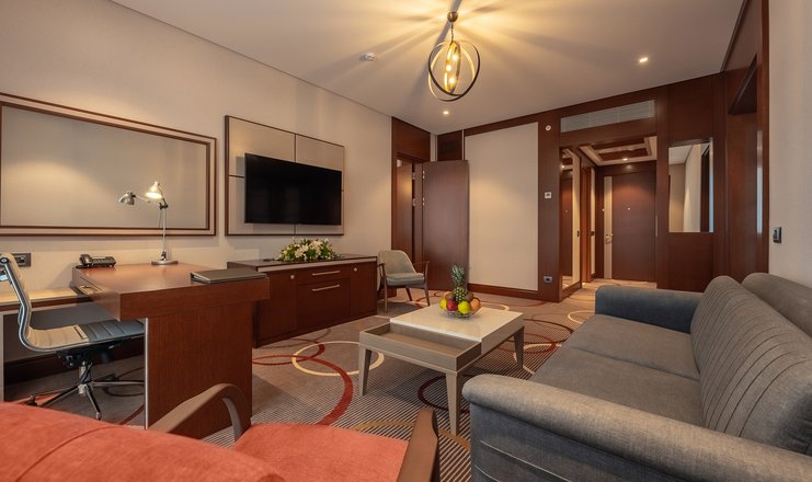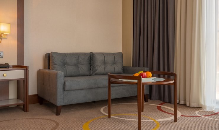 В номере: кровати односпальные /одна двуспальная кровать, прикроватные тумбочки, стол письменный, стул, шкаф, диван раскладной, мини-холодильник, сейф, сплит-система, телевизор ЖК, чайный набор посуды, электрочайник