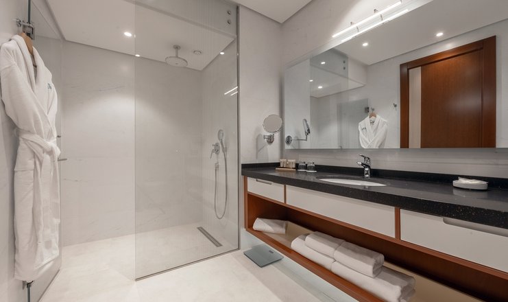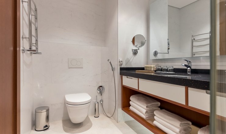 Санузел: душ, раковина, унитаз, биде, тапочки, туалетные принадлежности, фен, халат