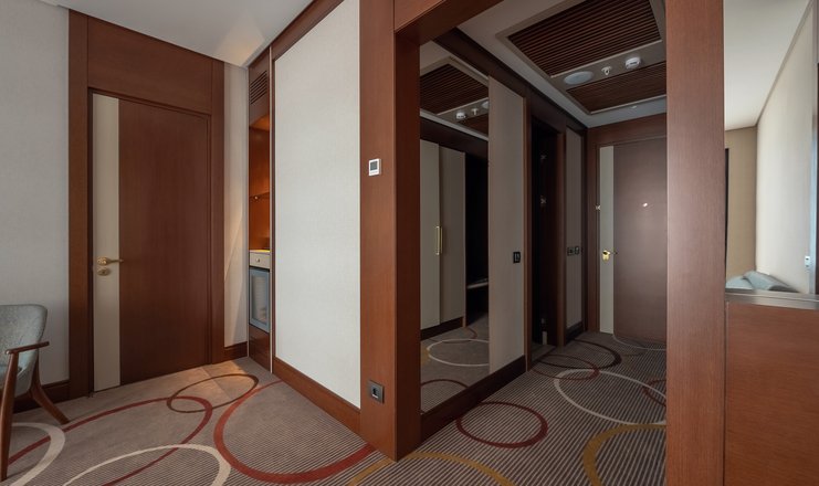 В номере: двуспальная кровать, две односпальные кровати, прикроватные тумбочки, стол письменный, стул, шкаф, два раскладных дивана, мини-холодильник, сейф, сплит-система, телевизор ЖК, чайный набор посуды, электрочайник, сейф, телефон