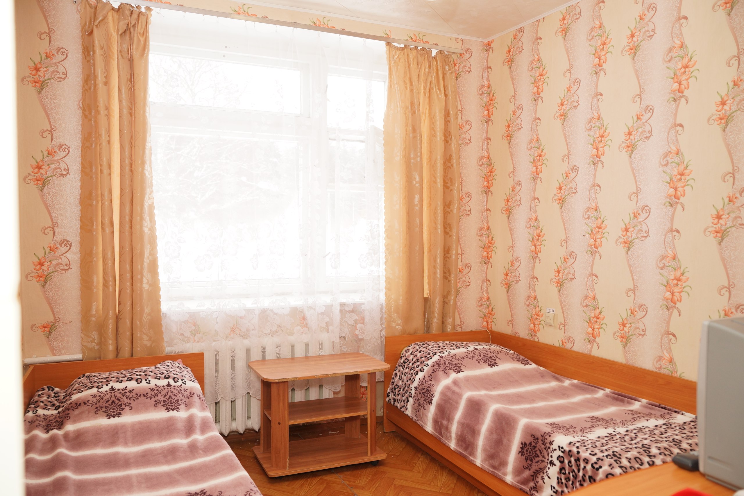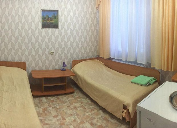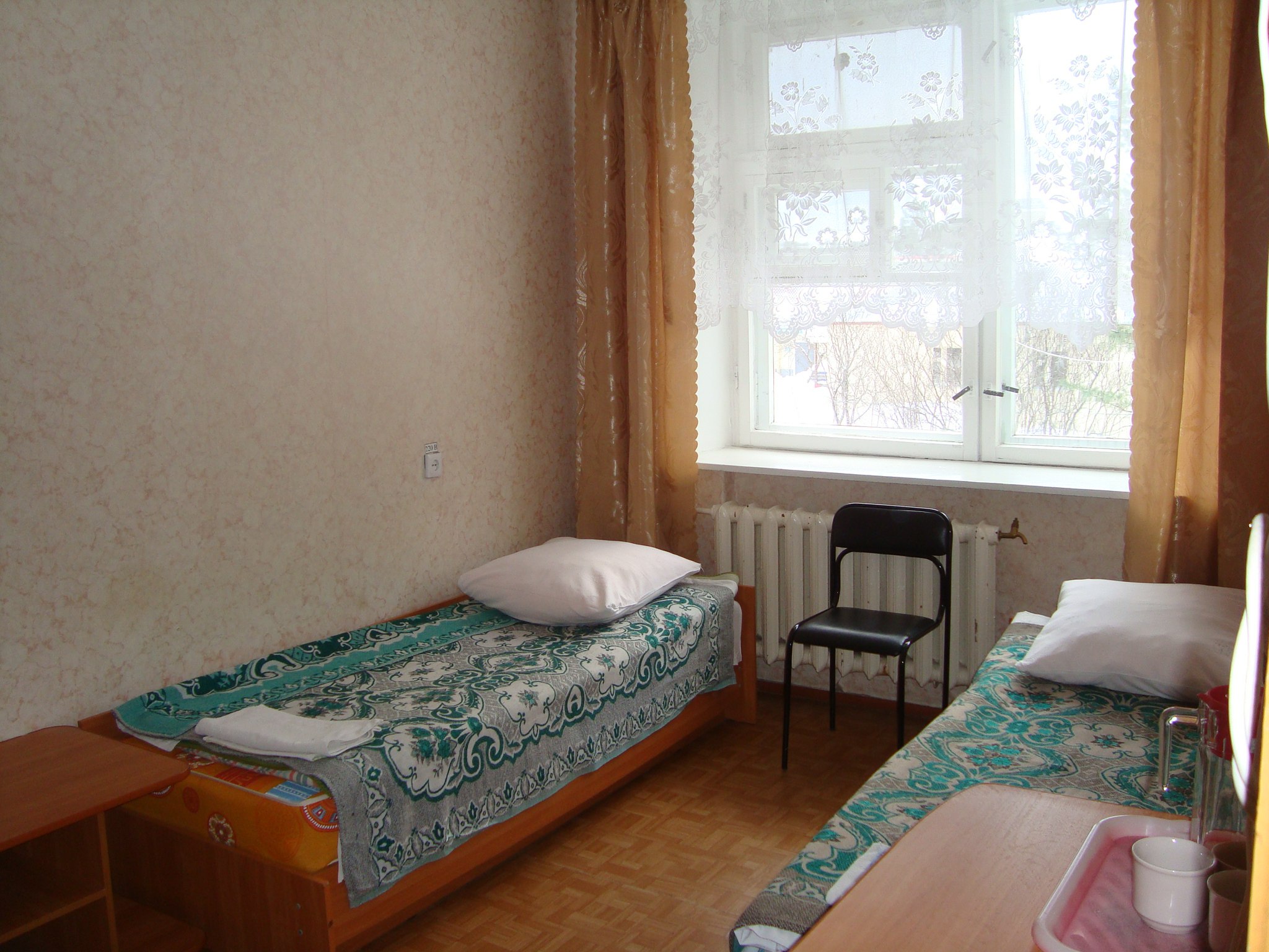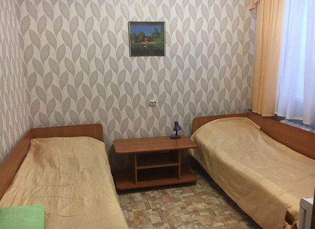 В номере: две односпальные кровати, прикроватные тумбы, стол, стулья, шкаф, радио, телевизор, набор стаканов и графин, кулер (на этаже)
