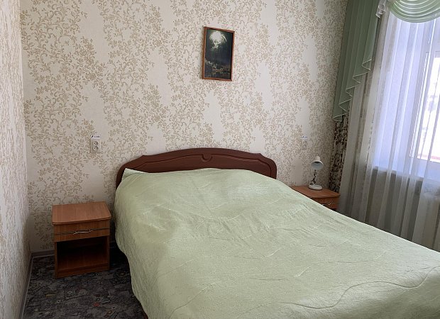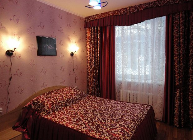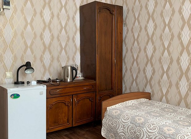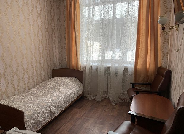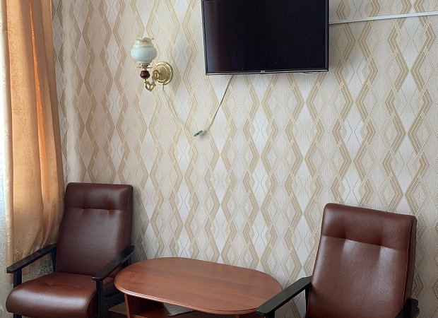В номере: полутораспальная кровать, прикроватные тумбы, стол, стулья, шкаф, кресла, радио, телевизор, холодильник, чайник, стаканы, утюг