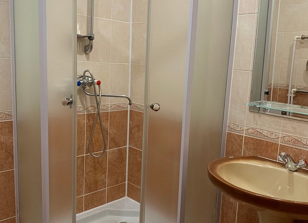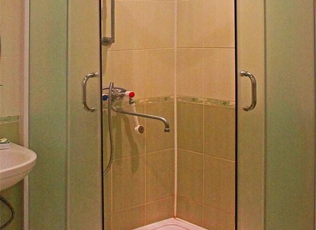 Санузел: душевая кабина, раковина, унитаз, банные полотенца