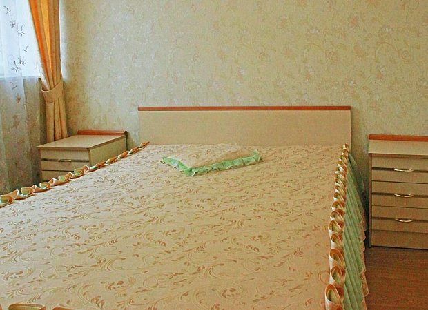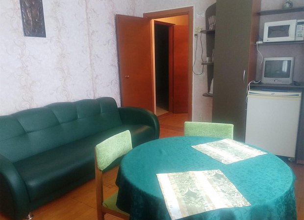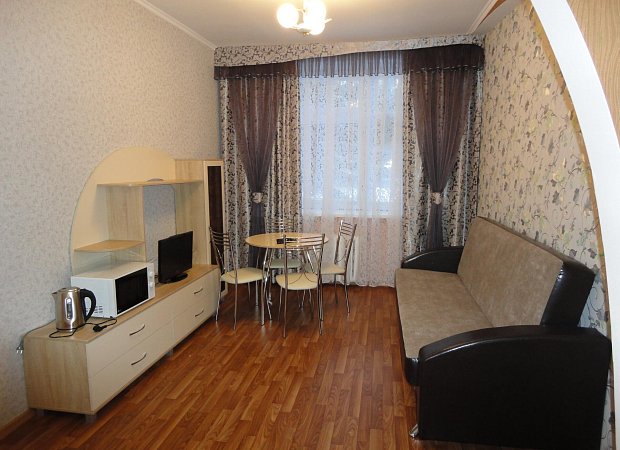 В номере: двуспальная кровать, прикроватные тумбы, стол, стулья, шкаф, диван, обеденный гарнитур, радио, телевизор, чайник, чайный набор, микроволновая печь