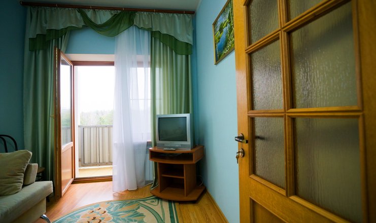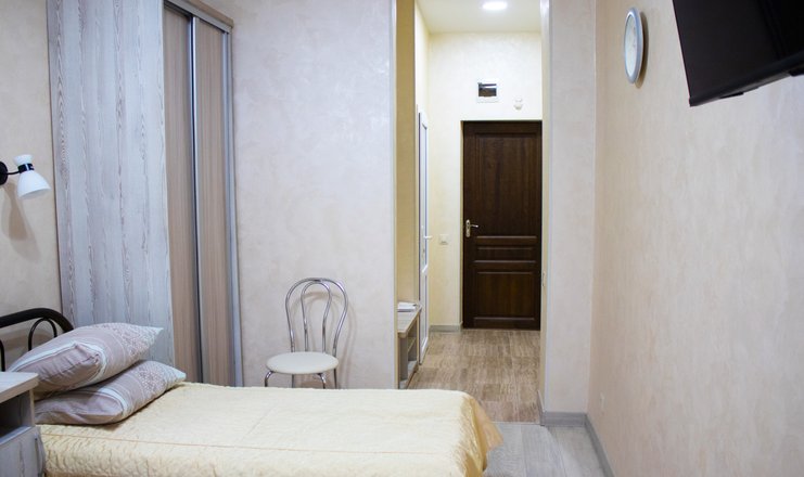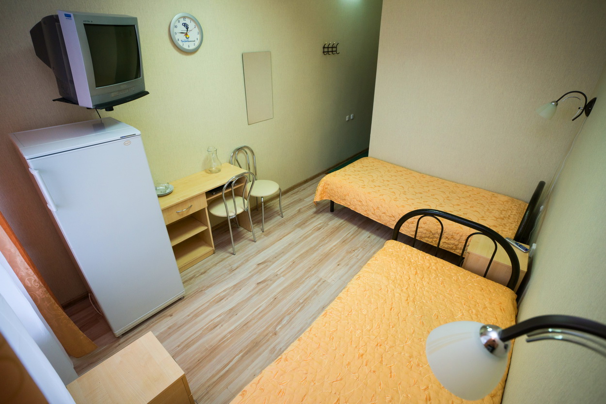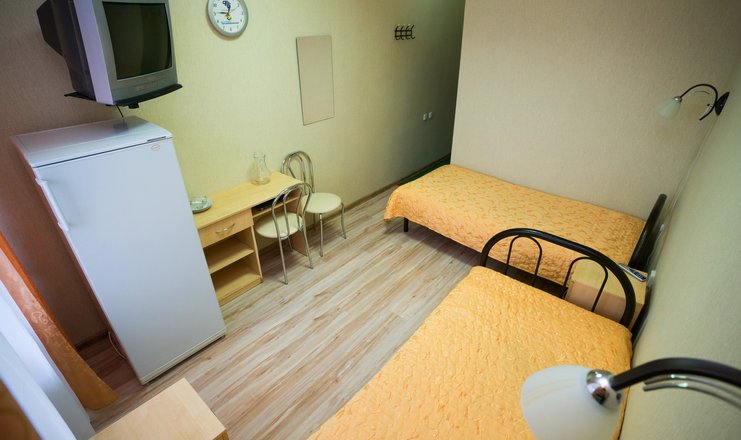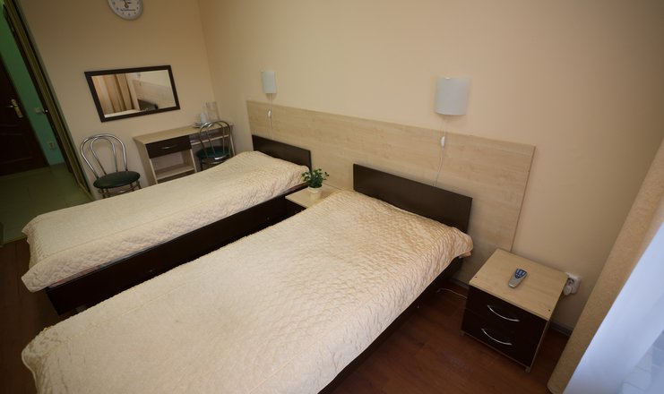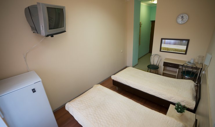 В номере: шкаф-купе, стол, 2 тумбочки, 2 стула, 2 односпальные кровати, ЖК телевизор, холодильник, зеркало, вешалка для верхней одежды, тумба для обуви.