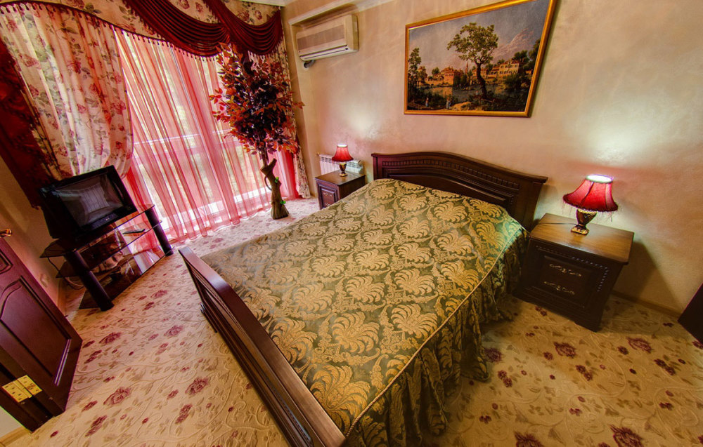 В номере: двуспальная кровать, прикроватные тумбы, стол, стулья, шкаф, холодильник, телевизор, набор посуды