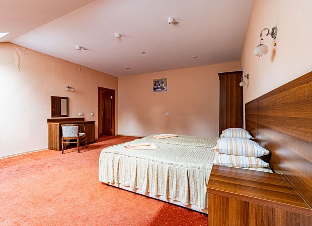 В номере: две полутороспальные кровати, шкаф, телевизор, холодильник, Wi-FI, зеркало, тумба