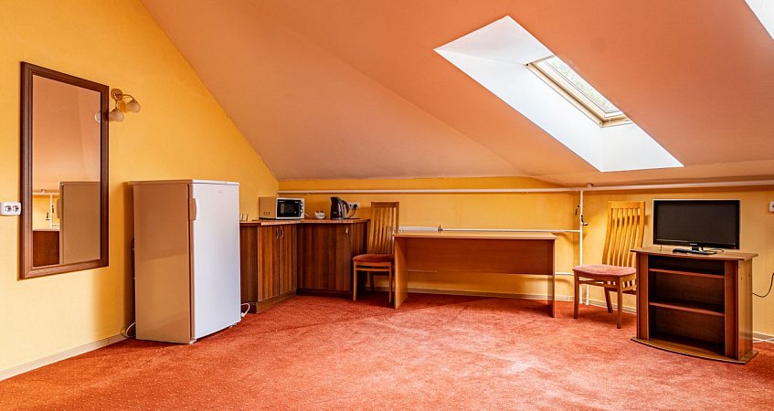 В номере: телевизор, холодильник, обогреватель, вентилятор, интернет, Wi-Fi, две полутороспальные кровати, шкаф для одежды, тумбы, стулья, диван