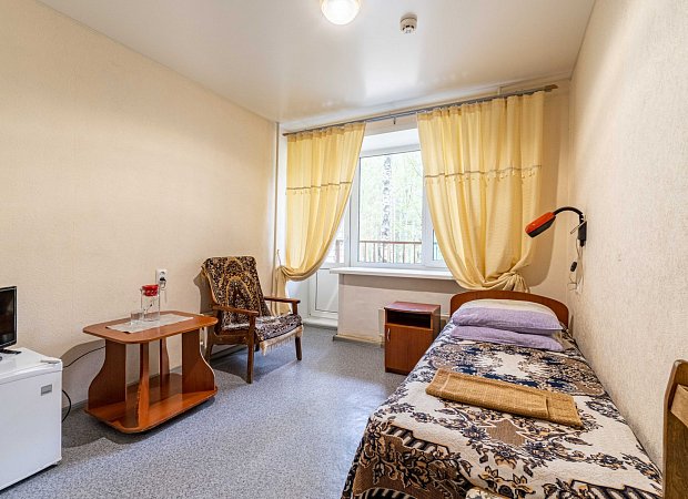 В номере: одна полутороспальная кровать, тумбочка, телевизор, шкаф, холодильник, Wi-Fi