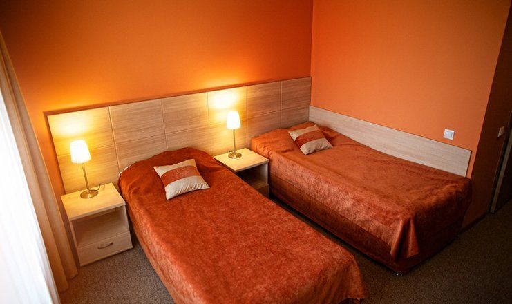 Оснащение номера: две односпальные кровати, прикроватные тумбочки, стол, стул, кресло, шкаф для одежды, кондиционер, телефон, холодильник
