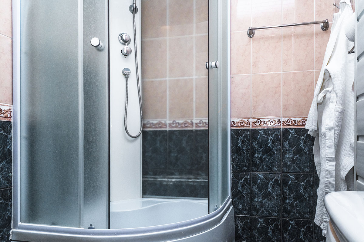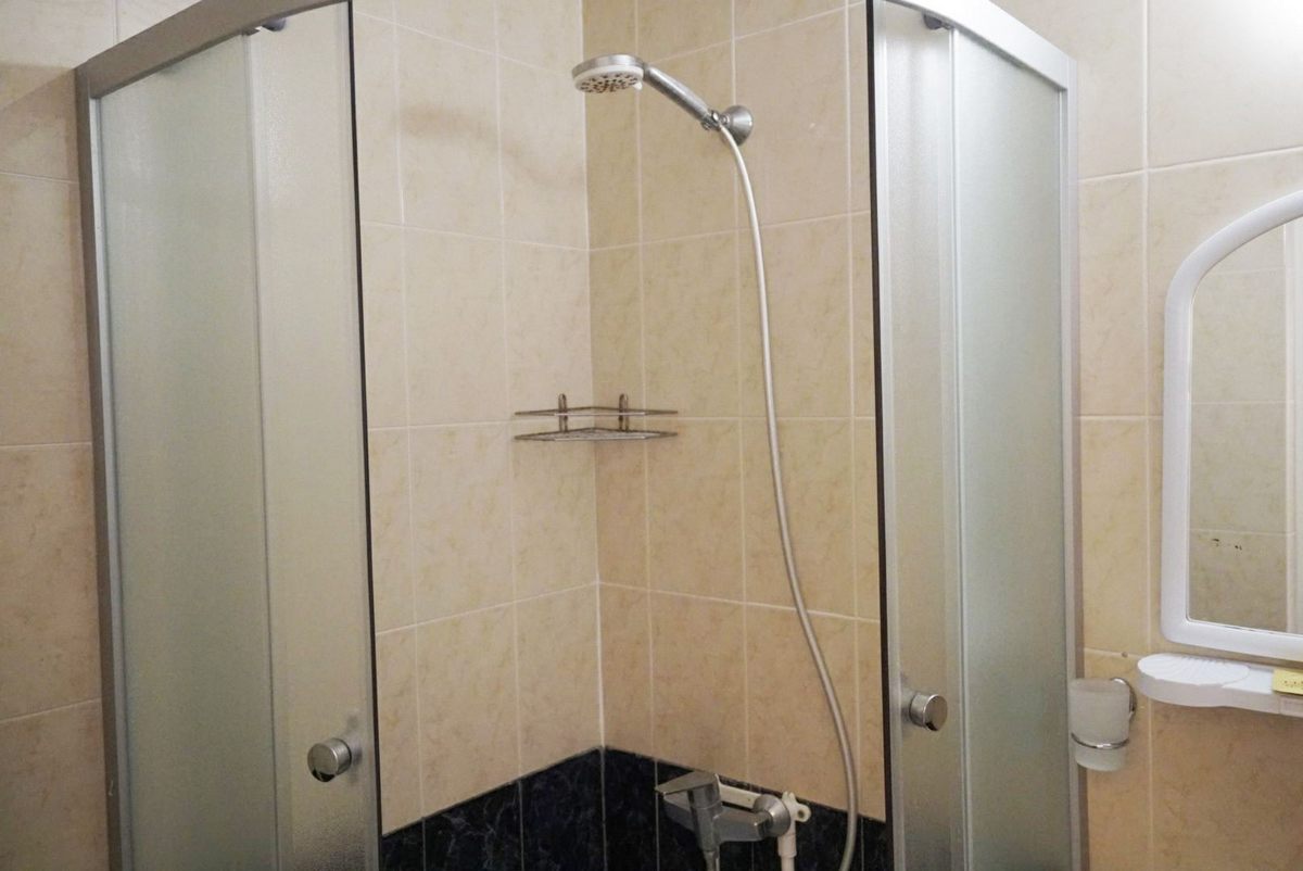 Санузел: душ (душевая кабина), раковина, туалет, фен, халаты