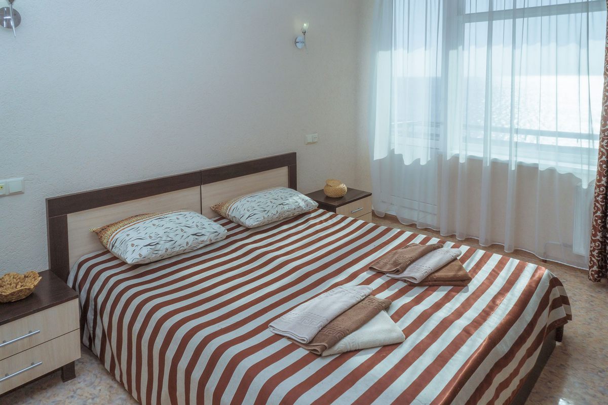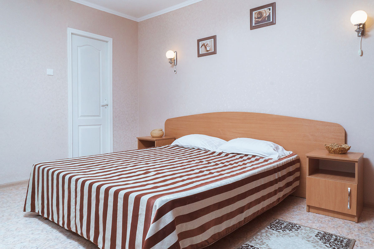 В номере: две комнаты: спальня и гостиная, 2-х спальная кровать, прикроватные тумбы, 2 кресла, журнальный столик, шкаф, телевизор, холодильник, слит-система, утюг и гладильная доска, чайник