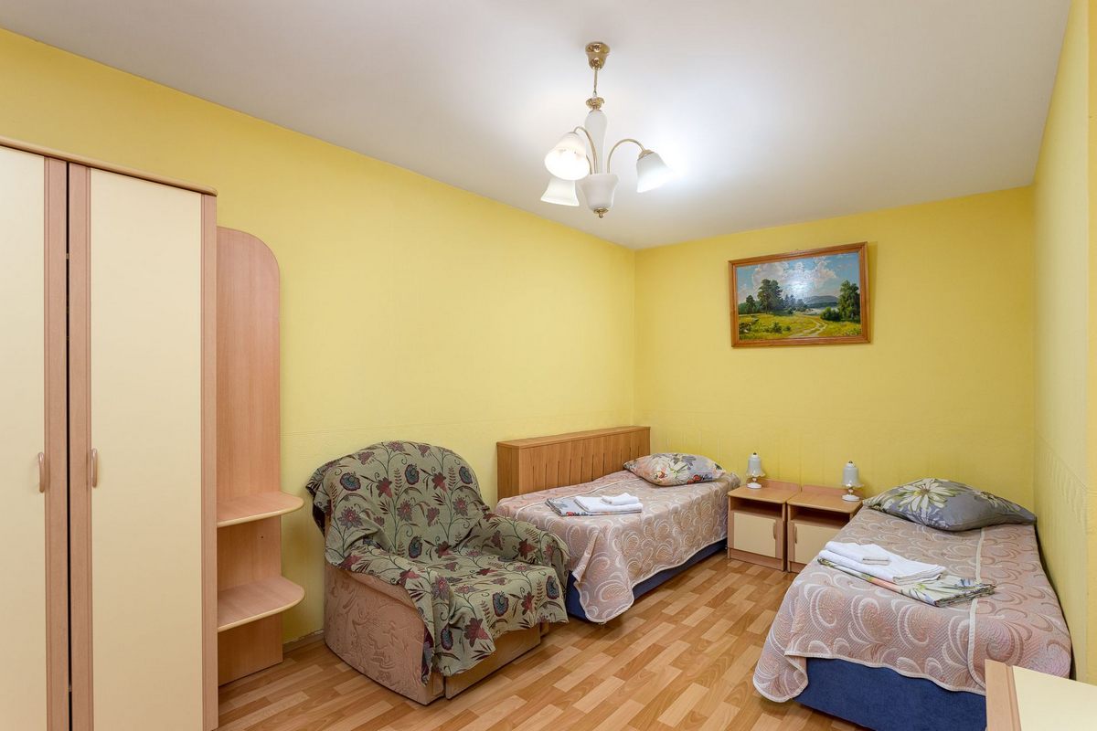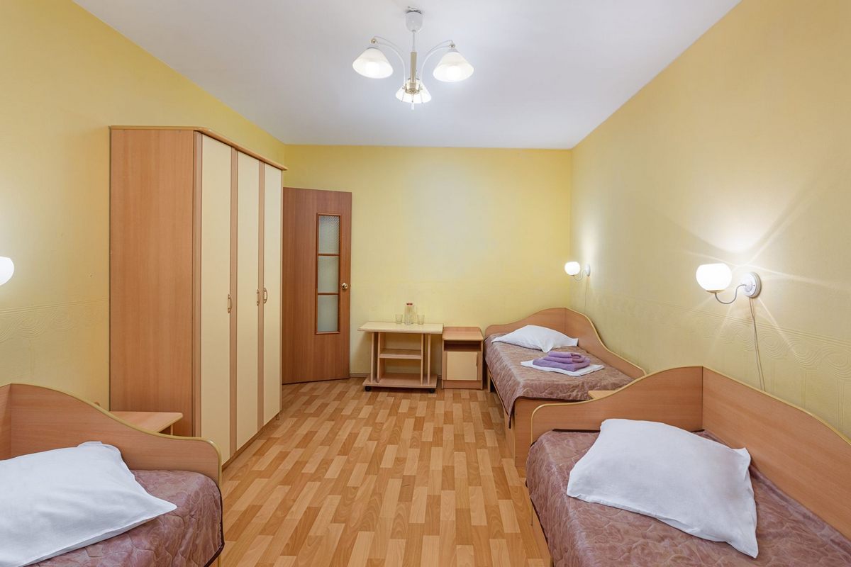 В номере: две односпальные кровати, прикроватные тумбы, стол, холодильник, телевизор, wi-fi