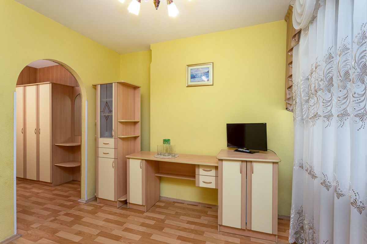 В номере: две комнаты: спальня и гостиная, две односпальные кровати или одна двуспальная, прикроватные тумбы, кресло, шкаф, стол, стенка, стол, холодильник, телевизор, wi-fi