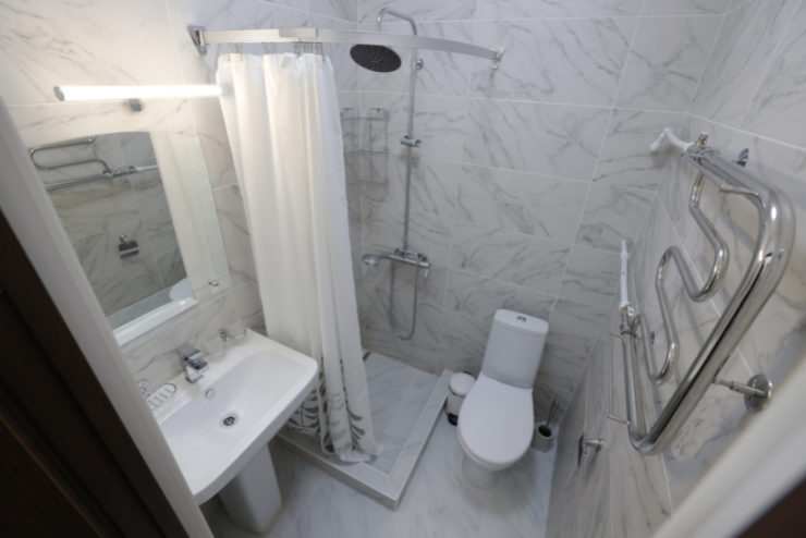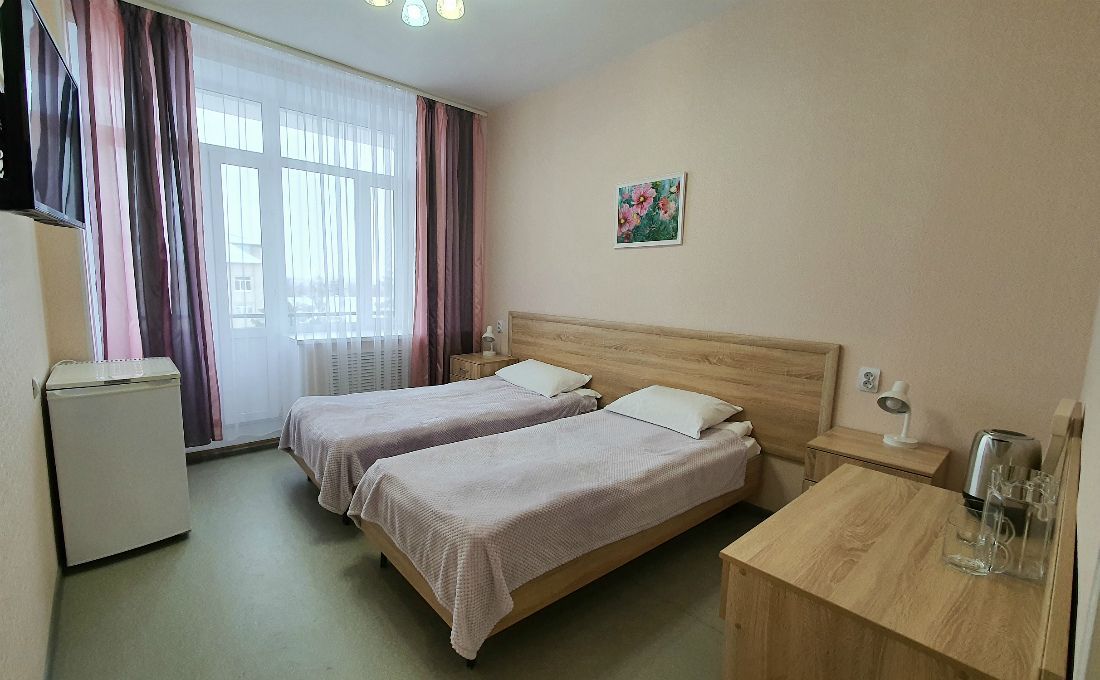 Оснащение номера: две односпальные кровати, прикроватные тумбы, стол, стулья, шкаф для одежды, телевизор, холодильник, электрочайник, бесплатный интернет Wi-Fi