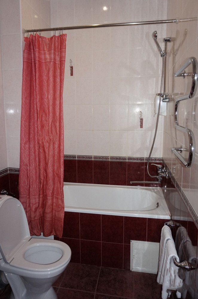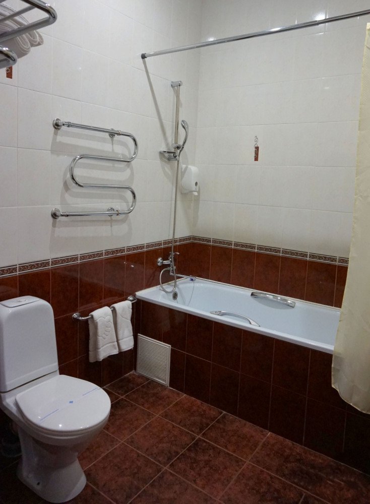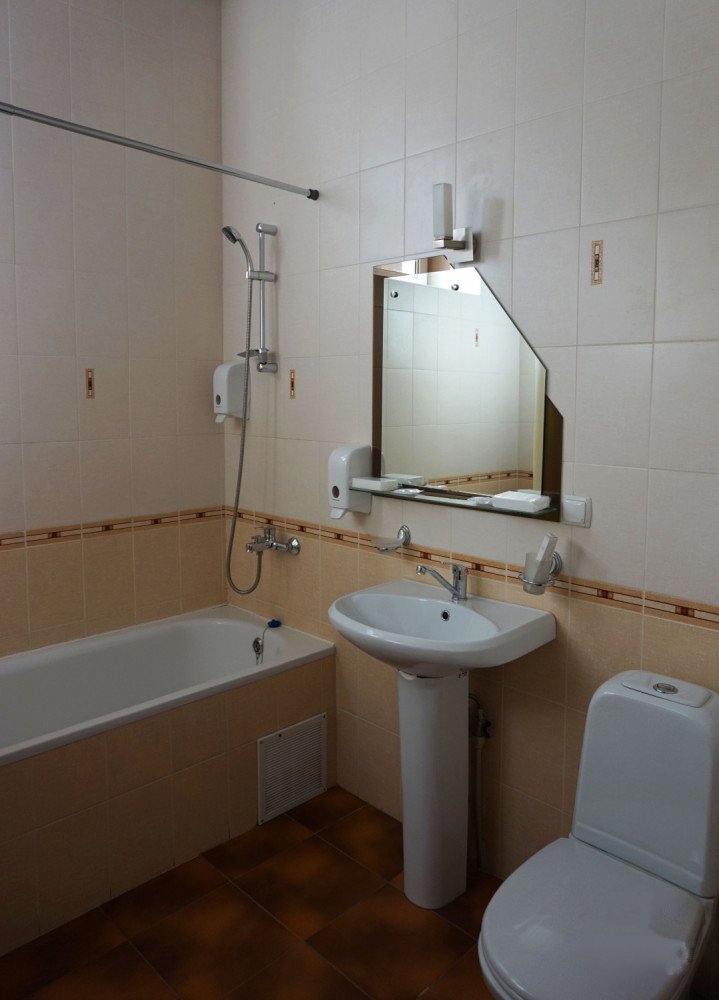 Сан-узел: ванна, умывальник, унитаз, фен.