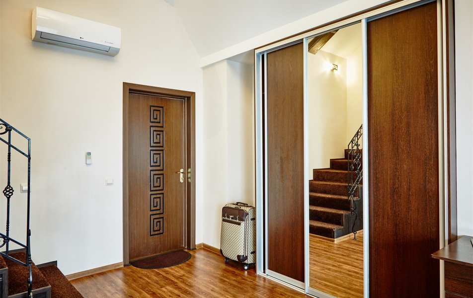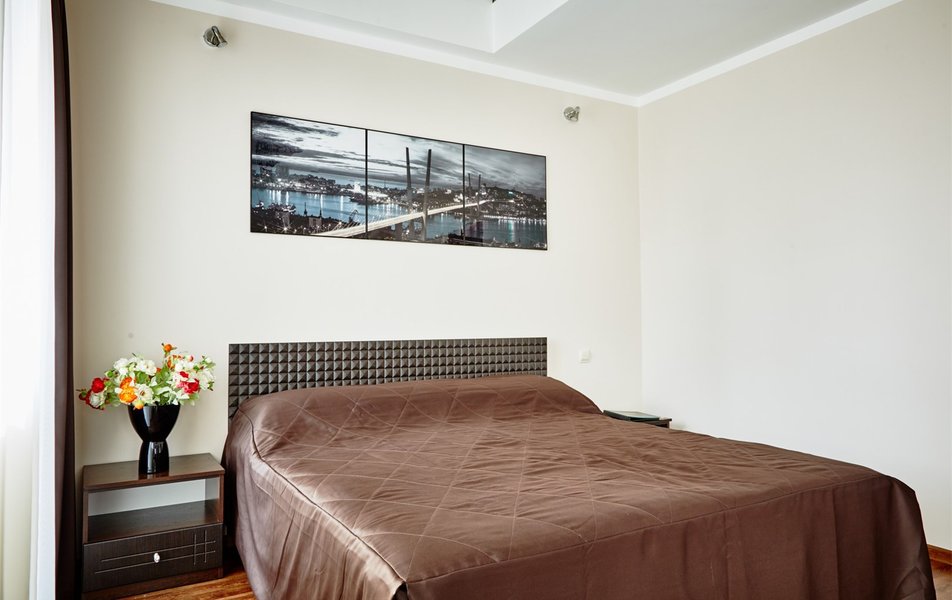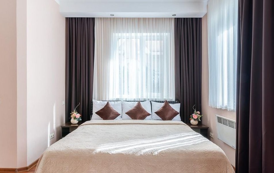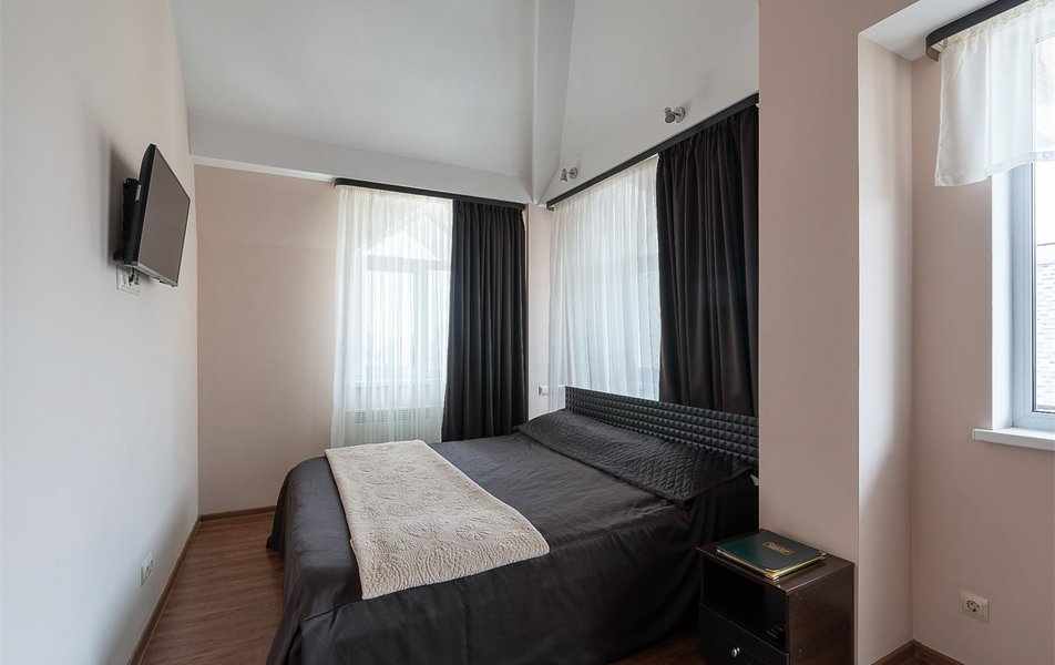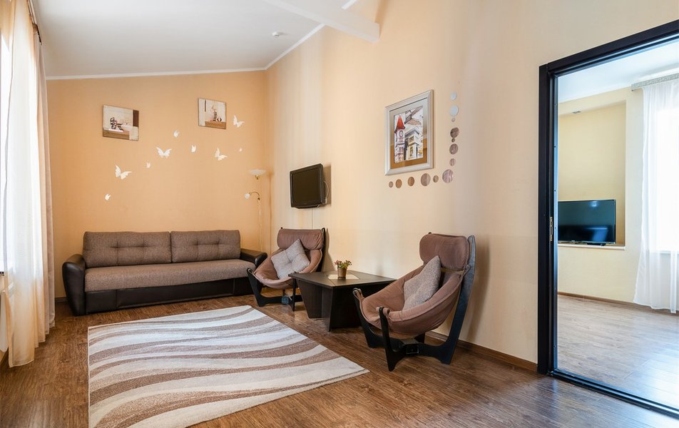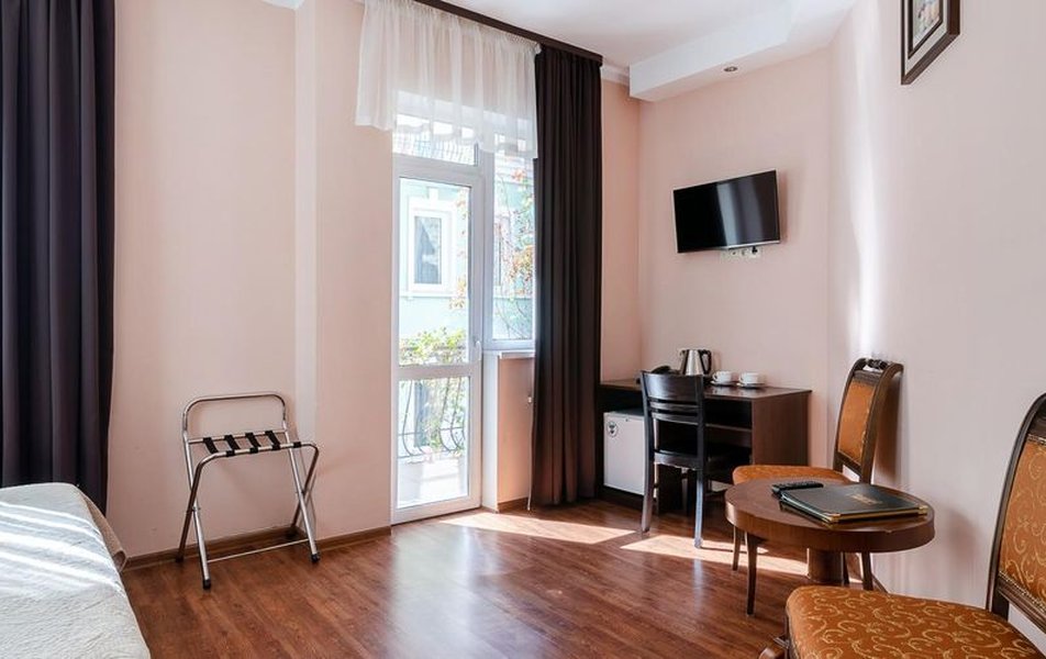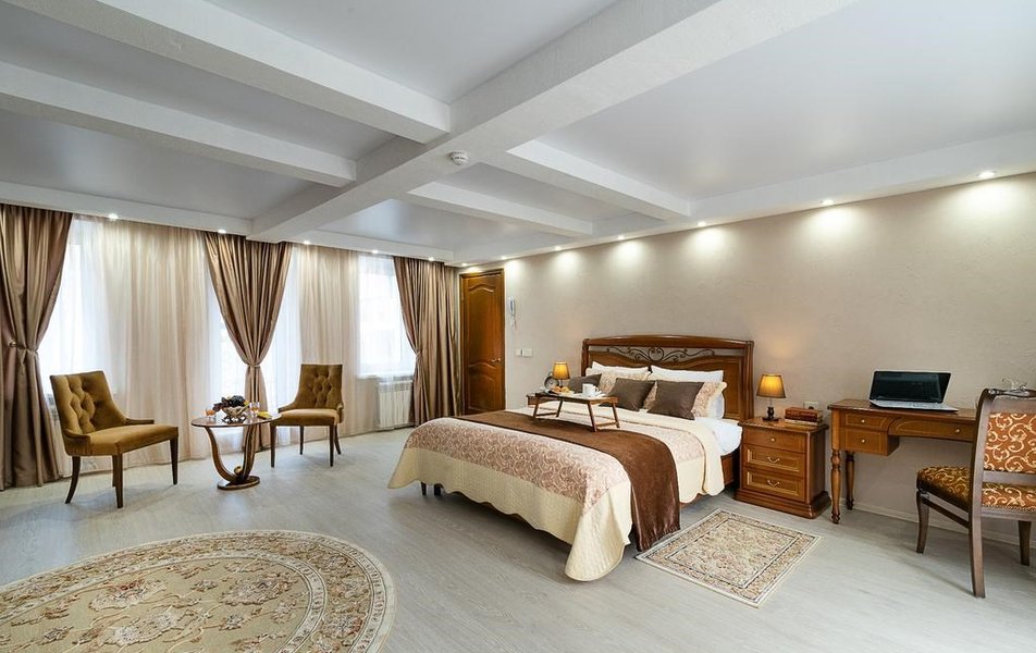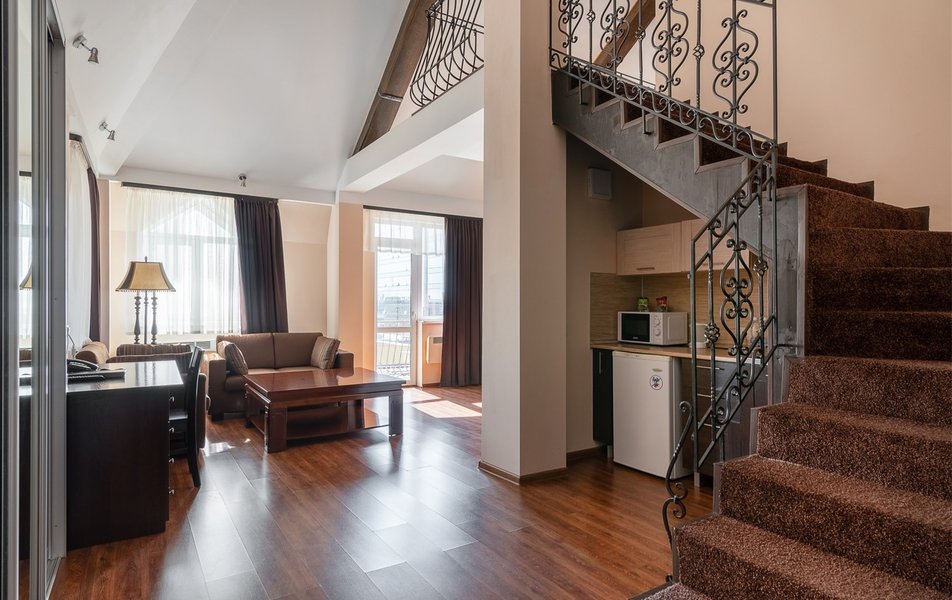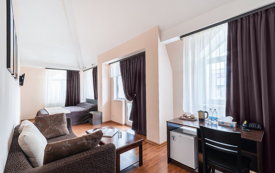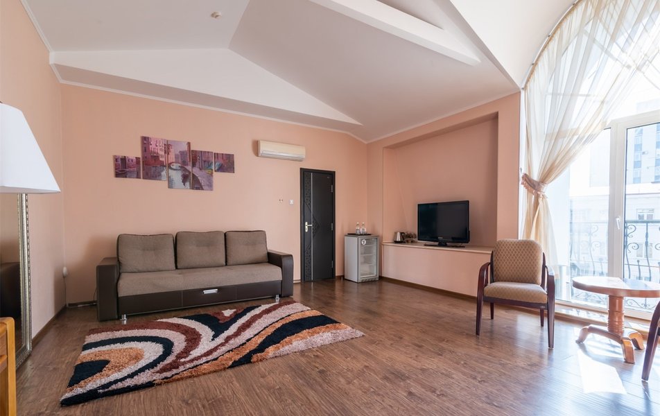 В номере: вешалка, зеркало, кровать двуспальная, набор мягкой мебели, прикроватные тумбочки, стол, стулья, шкаф, гладильная доска, индивидуальная система обогрева, кондиционер, мини-холодильник, телевизор, телефон, утюг, чайный набор посуды, электрочайник