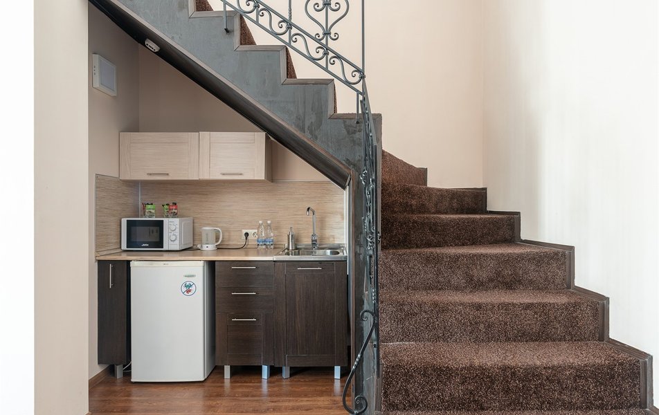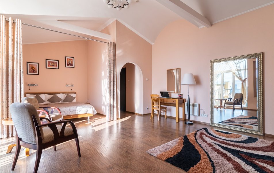 В номере: вешалка, зеркало, кровать двуспальная, набор мягкой мебели, прикроватные тумбочки, стол, стулья, шкаф, микроволновая печь, мини-холодильник, набор посуды, телевизор, телефон, чайный набор посуды, электрочайник