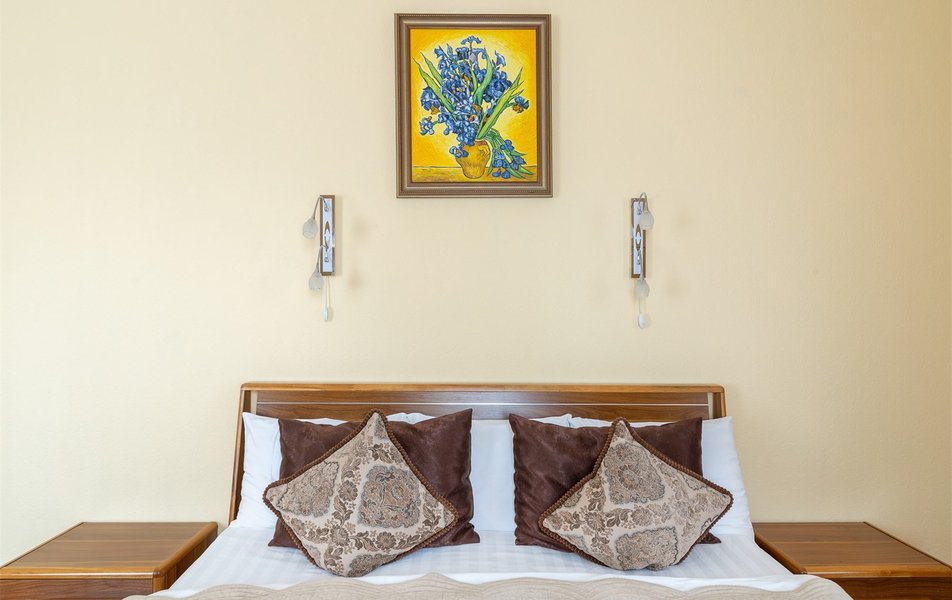 В номере: вешалка, зеркало, кровать двуспальная, прикроватные тумбочки, стол, стулья, шкаф, гладильная доска, кондиционер, мини-холодильник, телевизор, телефон, утюг, чайный набор посуды, электрочайник