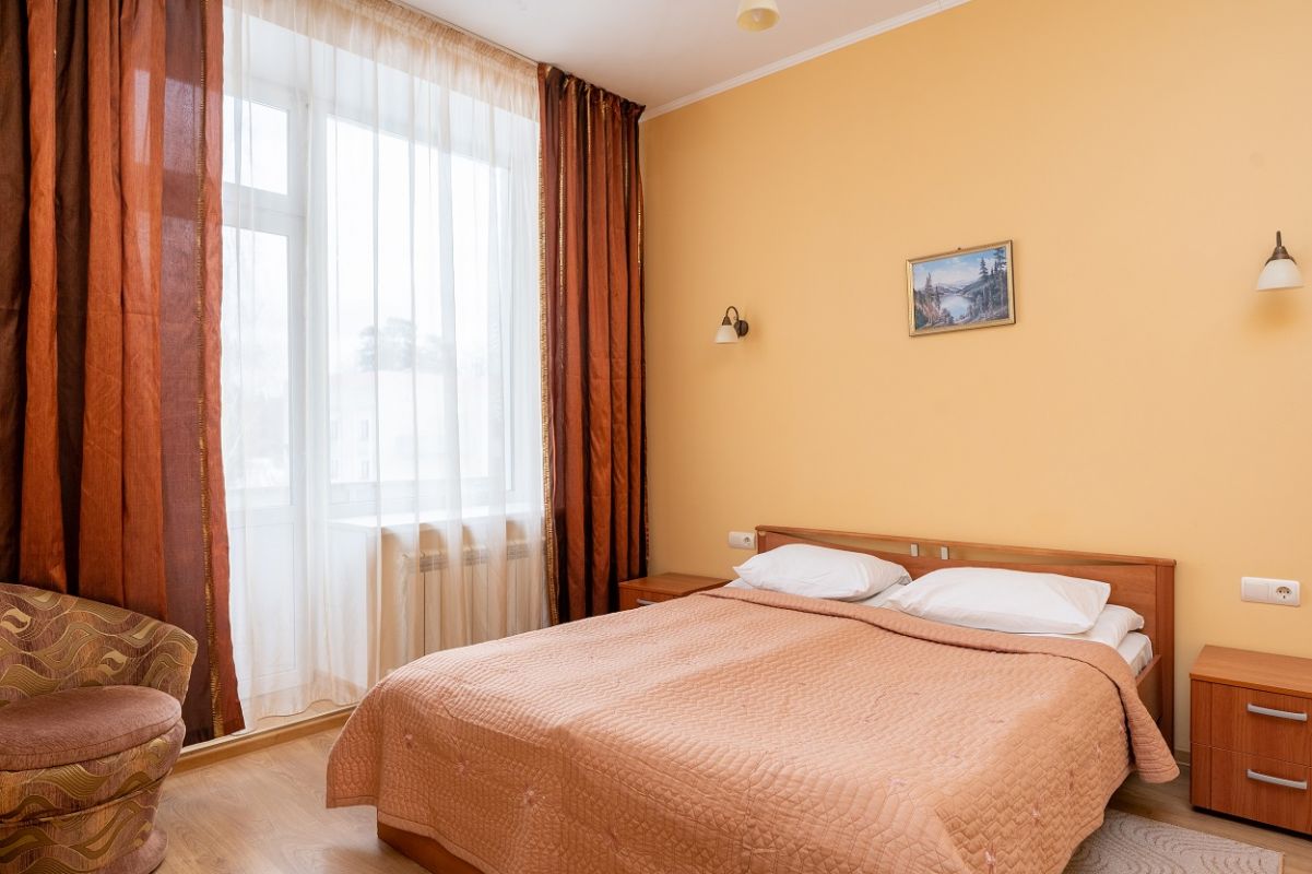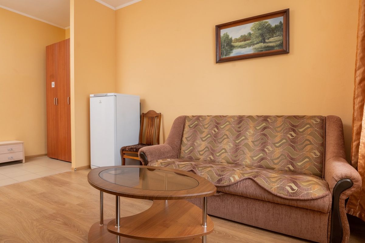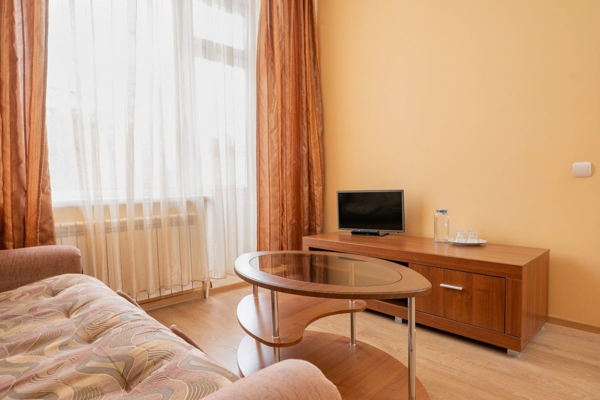 В номере: спальня, гостиная, ванная комната, балкон не во всех номерах. В спальне: одна двуспальная кровать или 2 раздельные кровати, в гостиной: диван, ТВ, холодильник, в ванной комнате: ванна или душ, туалет.