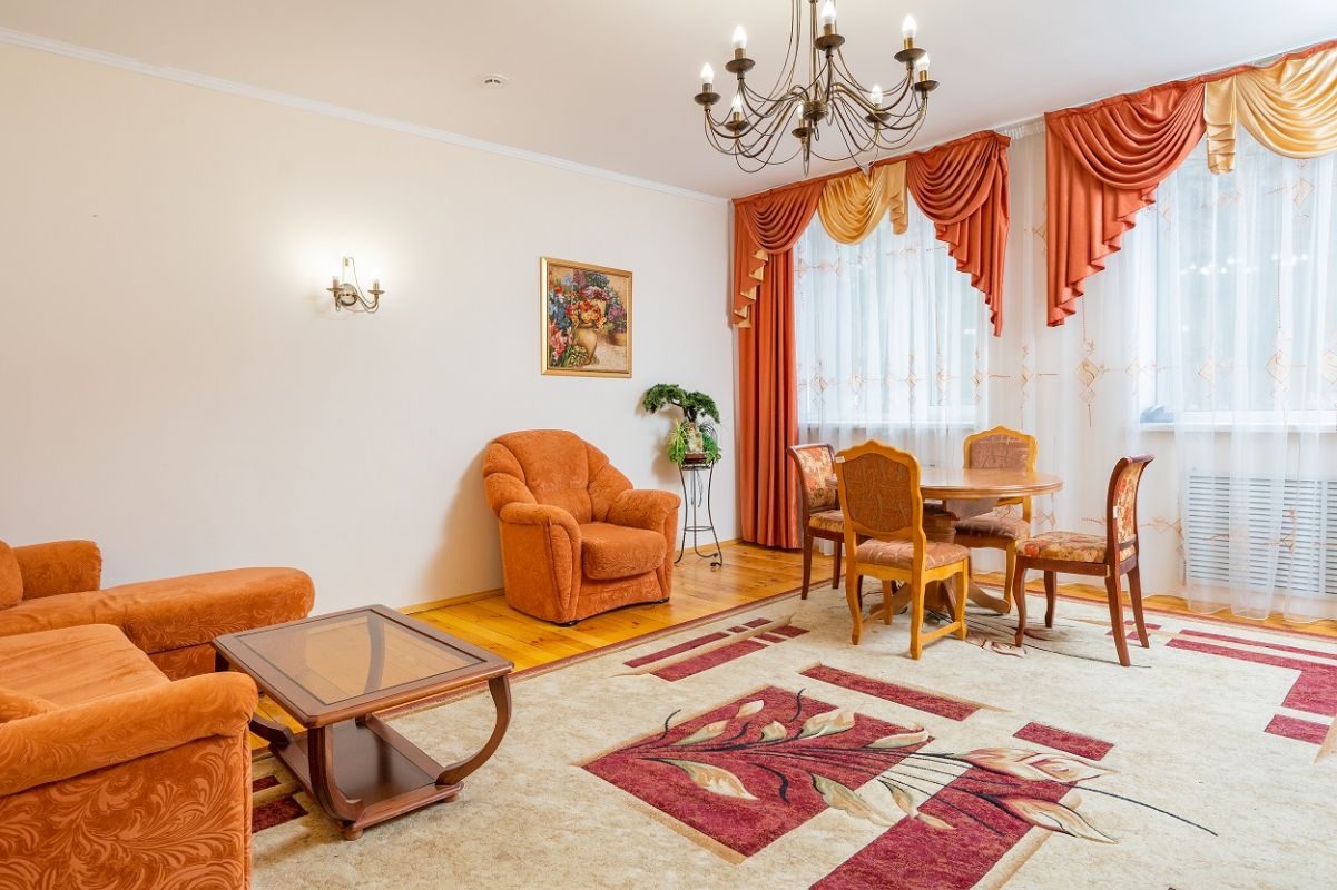 В номере: 2 спальни, гостиная с кухонной зоной, ванная комната. В спальне 1: двуспальная кровать, в спальне 2: двуспальная кровать, в гостиной: диван, ТВ. В кухонной зоне: СВЧ-печь, чайник, холодильник, набор посуды, обеденный стол. В ванной комнате: ванна или душевая кабина, туалет.