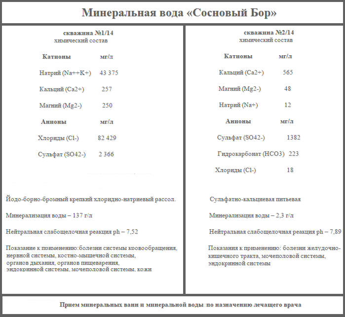 Благодаря высокой эффективности, доступности, отсутствию побочных эффектов, а также экологической чистоте использование минеральной воды является необходимым в лечении и профилактике многих болезней человека и улучшения общего состояния. Не нужно ехать далеко, приглашаем пройти курс оздоровления уникальной минеральной водой в санатории "Сосновый бор" И летом и зимой и в межсезонье "Сосновый бор" подарит Вам здоровье!