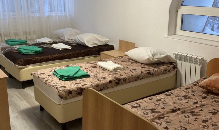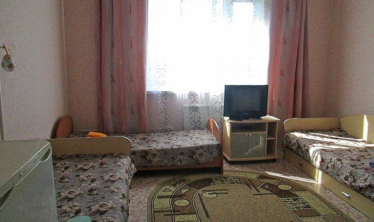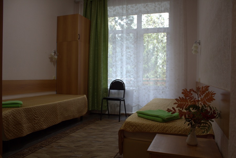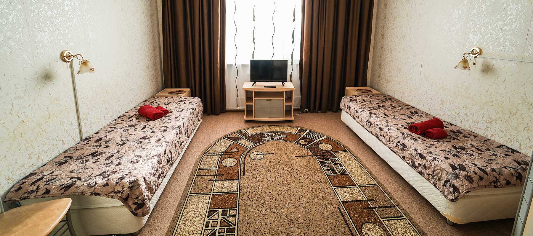 В номере: кровати полутораспальные, прикроватные тумбочки, шкаф, телевизор, холодильник