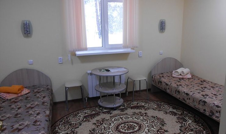 В номере: кровати полутораспальные, прикроватные тумбочки, шкаф, журнальный стол, телевизор, холодильник