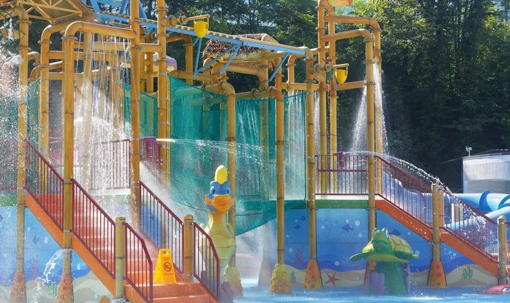Открытый плавательный бассейн в сантории Спутник в Сочи, с подогреваемой водой +27 C (всесезонный), с каскадным водопадом, противотоками и гидромассажем, длина дорожки 25 м, глубина 1,8 м; «малая чаша» бассейна (работает в летний период).