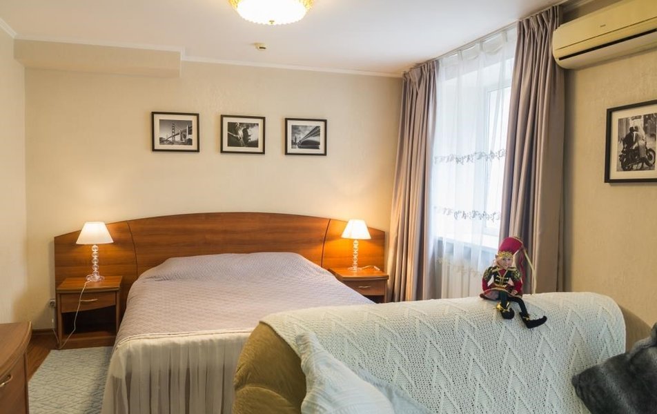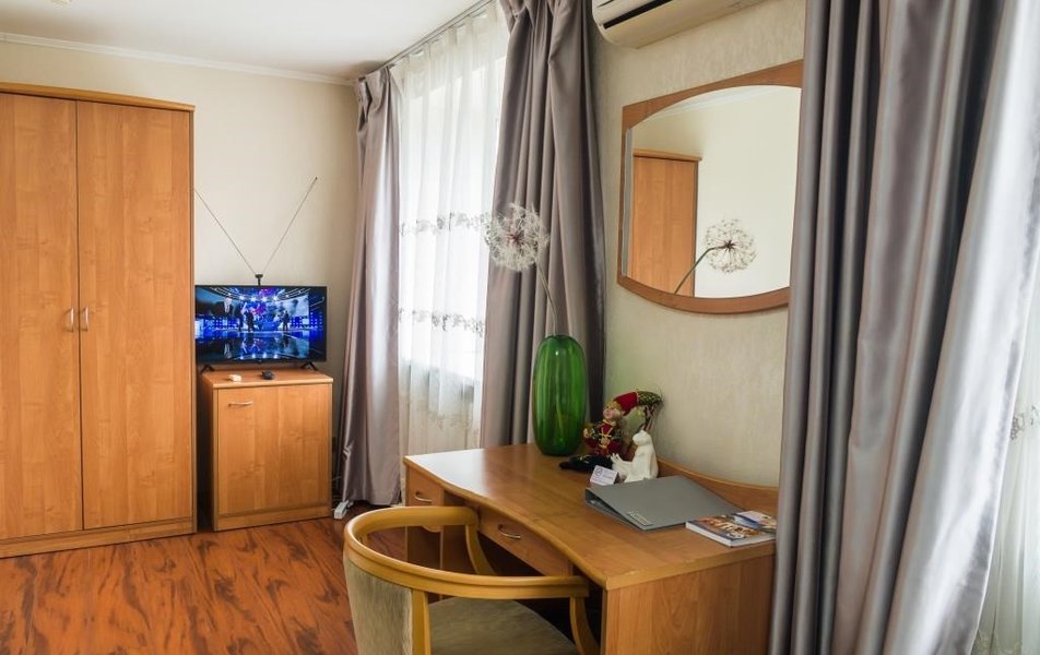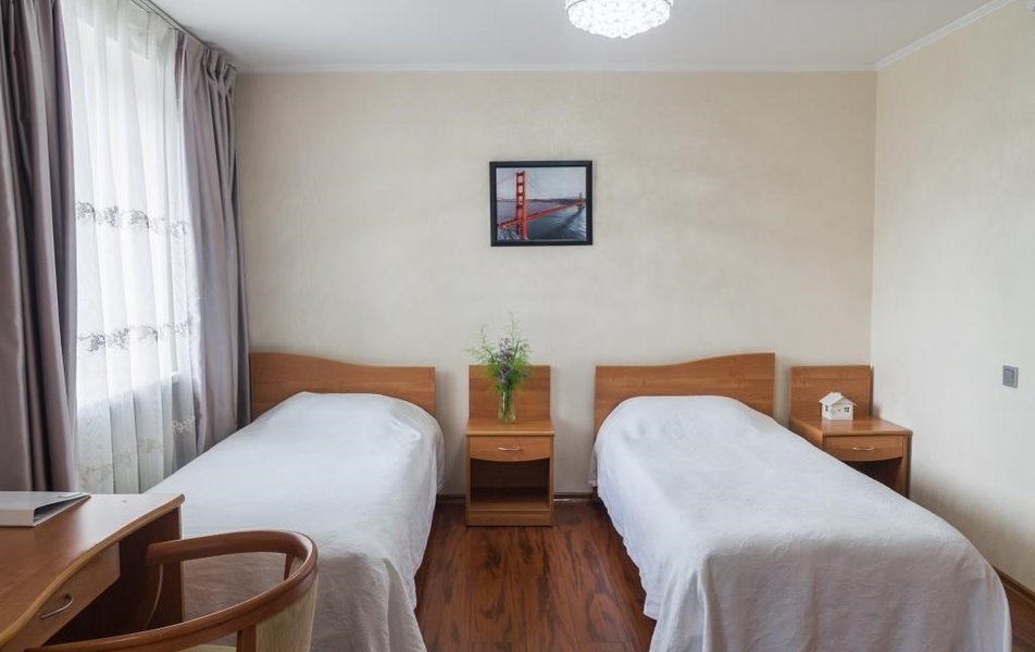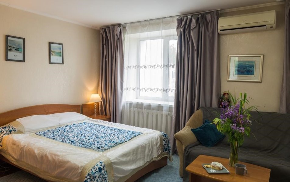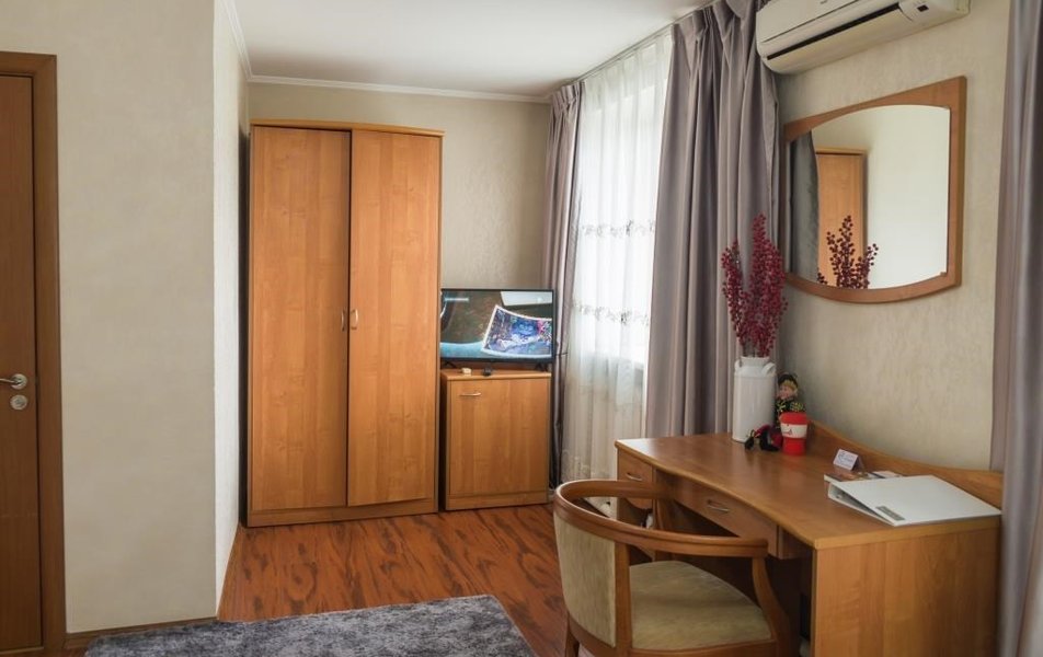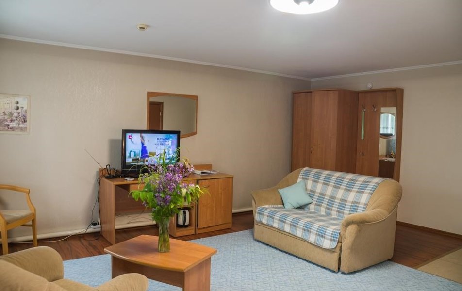 Оснащение номера: диван раскладной, кровати односпальные, прикроватные тумбочки, стол, столик журнальный, стул, шкаф, гладильная доска, кондиционер, мини-холодильник, телевизор, утюг, чайный набор посуды, электрочайник