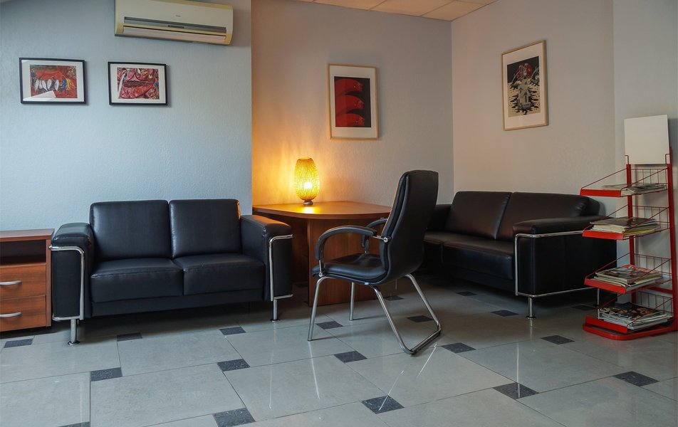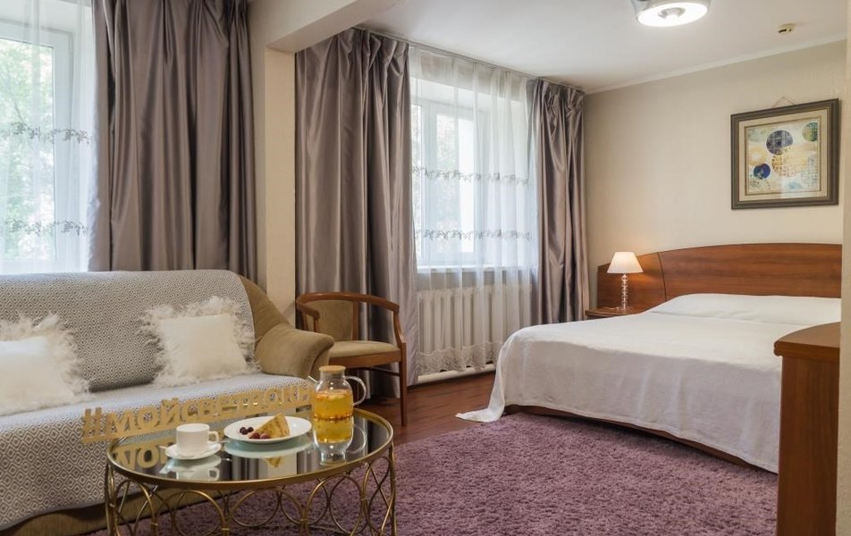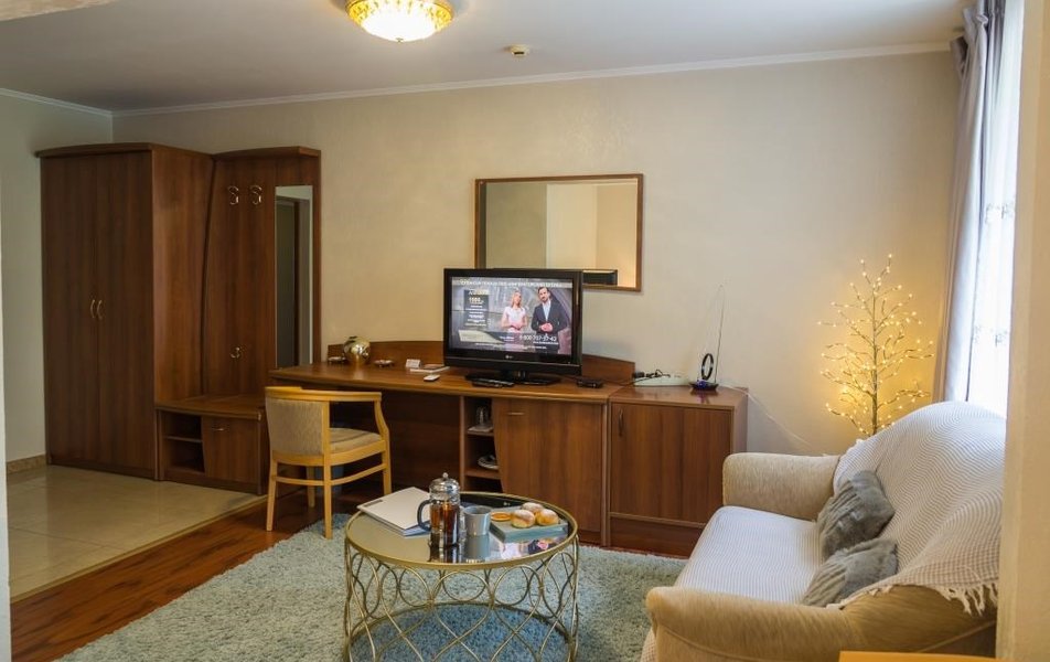 Оснащение номера: диван раскладной, кресло, кровать двуспальная, прикроватные тумбочки, стол, столик журнальный, стулья, шкаф, гладильная доска, кондиционер, мини-холодильник, телевизор, утюг, чайный набор посуды, электрочайник