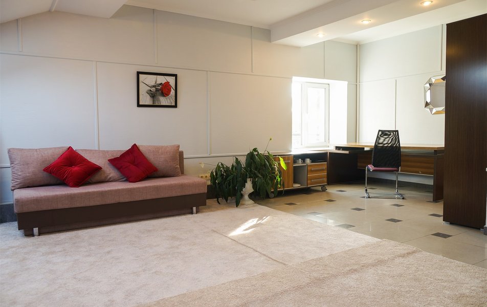 Оснащение номера: диван, диван раскладной, кровать двуспальная, прикроватные тумбочки, стол, столик журнальный, стул, шкаф, гладильная доска, кондиционер, мини-холодильник, телевизор, утюг, чайный набор посуды, электрочайник