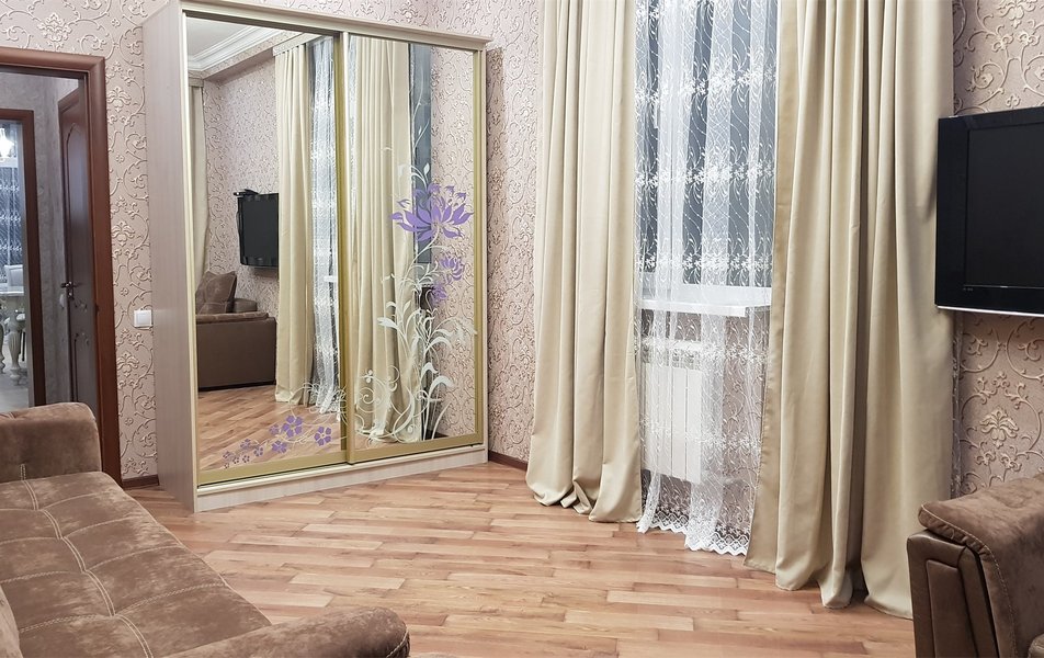 В номере: вешалка, диван раскладной, зеркало, кровать двуспальная, прикроватные тумбочки, стол, стулья, шкаф, Мини-кухня, набор посуды, плита электрическая, телевизор, холодильник, чайный набор посуды, электрочайник