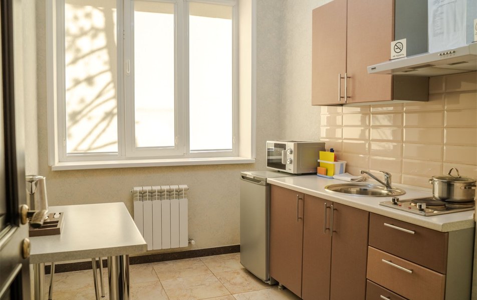 В номере: Кухня, вешалка, зеркало, кровати односпальные, прикроватные тумбочки, стол, стулья, шкаф, микроволновая печь, мини-холодильник, набор посуды, плита электрическая, телевизор, чайный набор посуды, электрочайник
