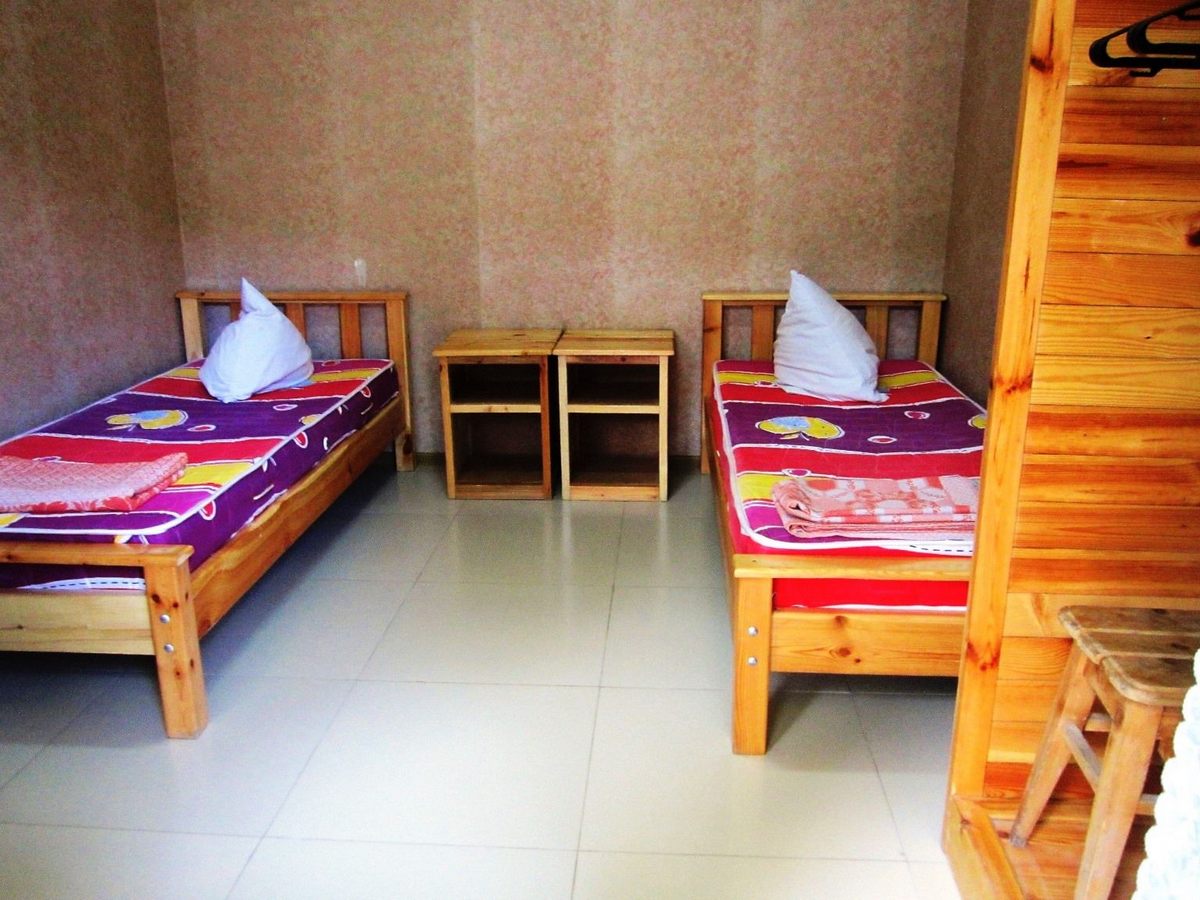 В домиках: односпальные или двуспальные кровати, прикроватные тумбочки, стол, стул, шкаф