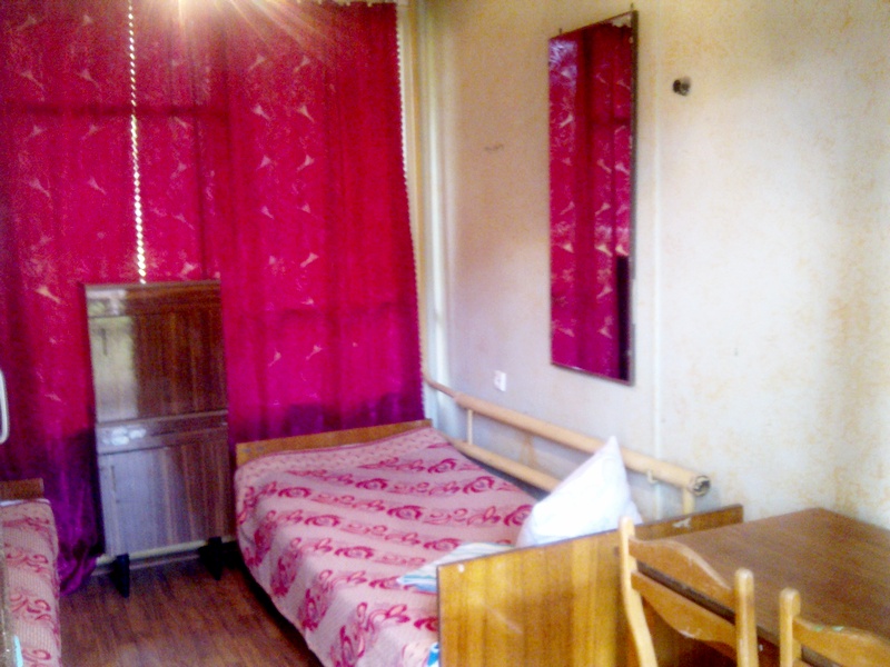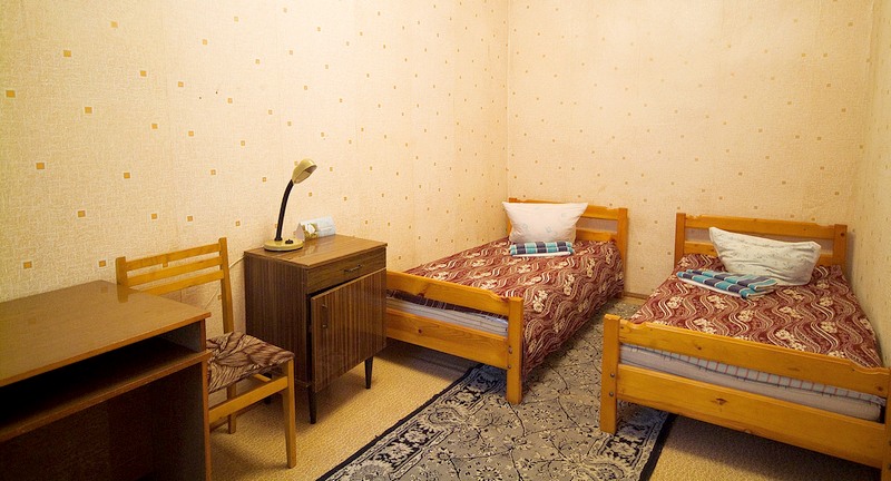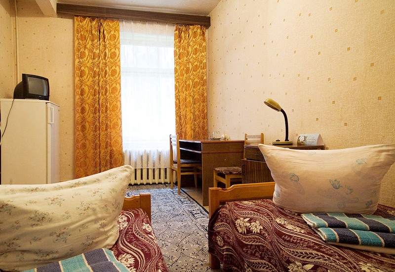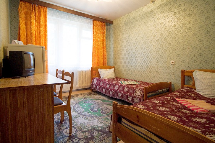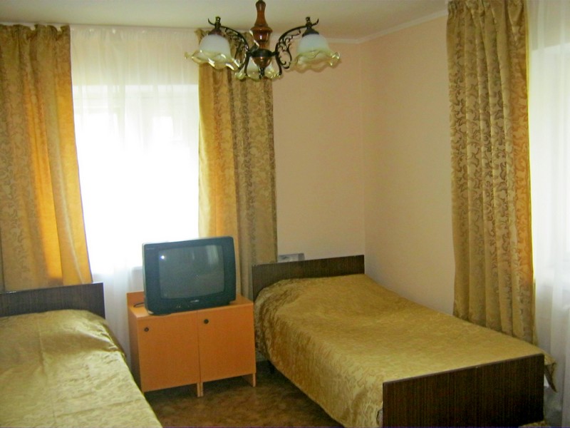 В номере: две односпальные кровати, тумбочки, холодильник, телевизор, стол, стулья, кресло.
