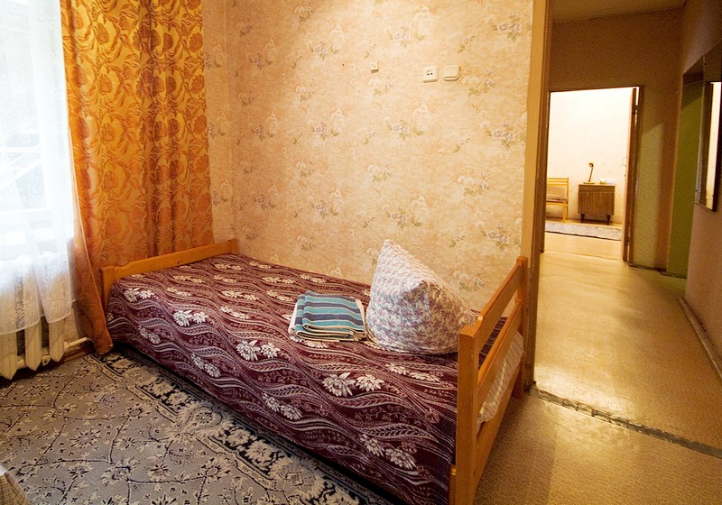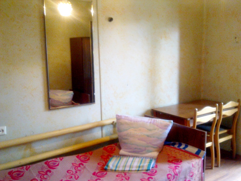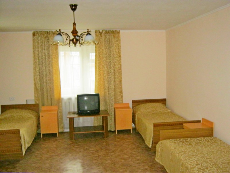 В номере: три односпальные кровати, тумбочки, холодильник, телевизор, стол, стулья, кресло.