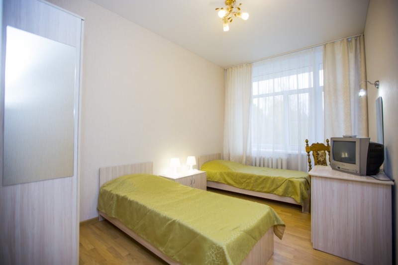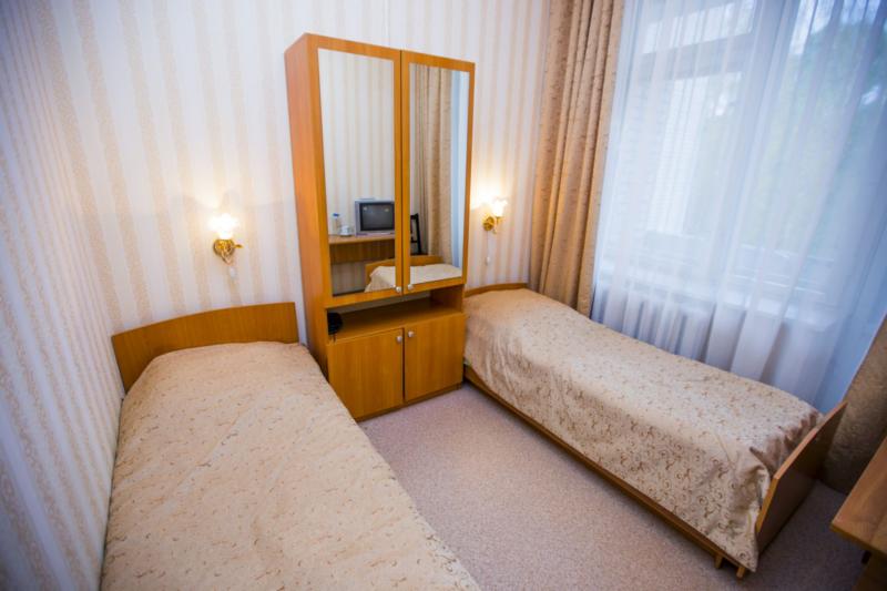 В номере: ТВ, холодильник, шкаф для одежды, стулья, тумбы, две кровати.