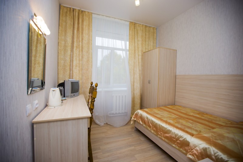 В номере: ТВ, холодильник, шкаф для одежды, стулья, тумбы, 1-а кровать.