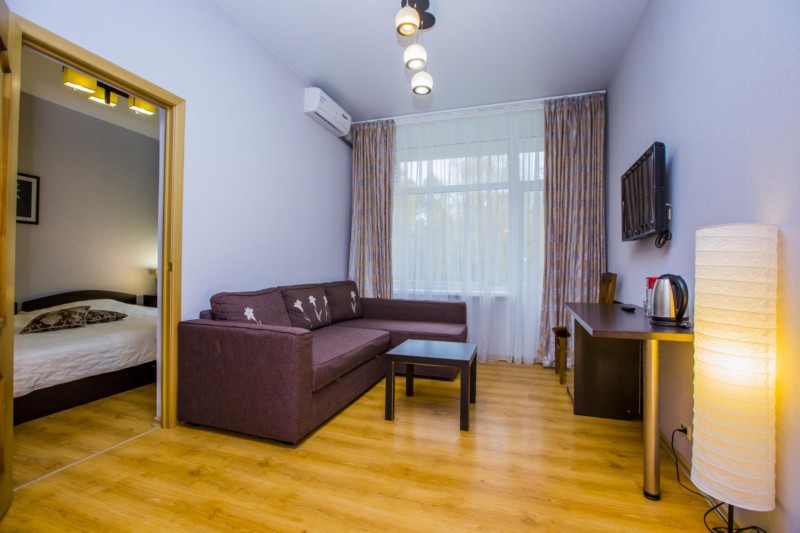 В номере: спальня, гостиная, ТВ, шкаф, мягкая мебель, кондиционер, холодильник, одна большая кровать.