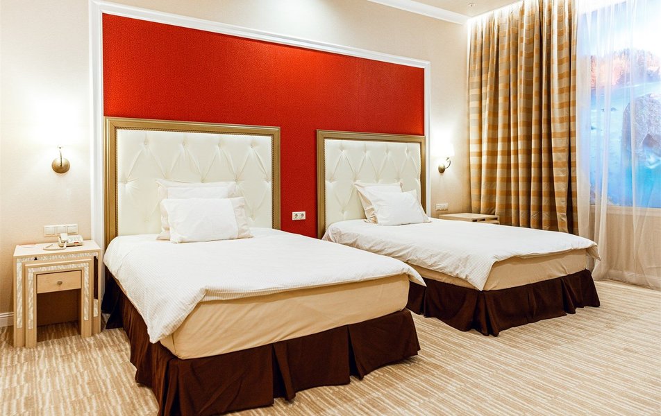 В номере: вешалка, зеркало, кровати односпальные, прикроватные тумбочки, стол, стулья, шкаф, кондиционер, сейф, телевизор, телефон, холодильник
