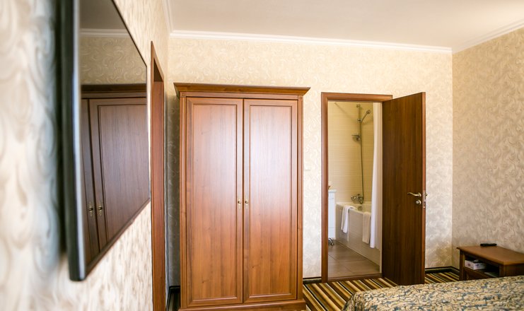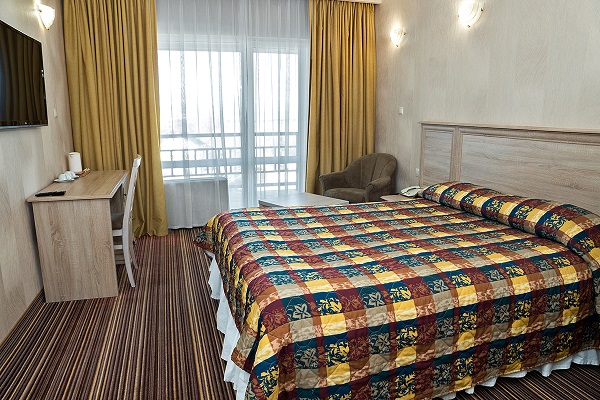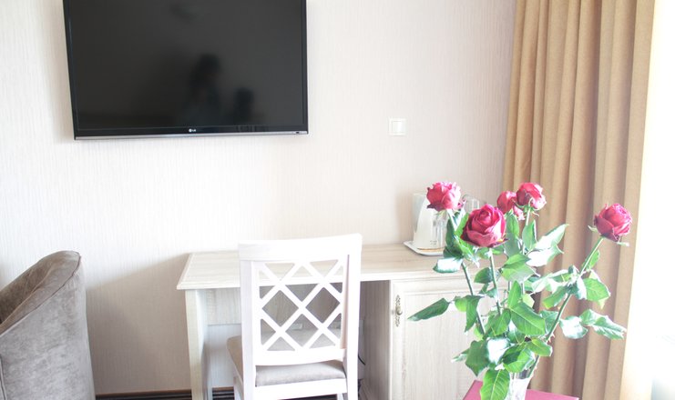 В номере: вешалка, зеркало, кровать двуспальная, раскладушка  на доп. место, прикроватные тумбочки, стол, стулья, шкаф, мини-холодильник, сплит-система, телевизор, телефон, чайный набор посуды, электрочайник