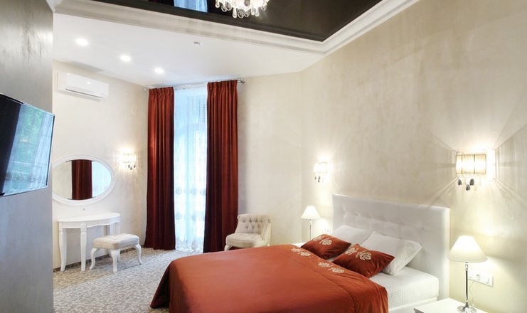 В номере: вешалка, гардеробная, диван, зеркало, комод, кресла, кровать двуспальная, набор мягкой мебели, прикроватные тумбочки, стол, столик туалетный, шкаф, шкаф-купе, мини-кухня, кондиционер, мини-холодильник, телевизор ЖК, утюг, чайный набор посуды, электрочайник