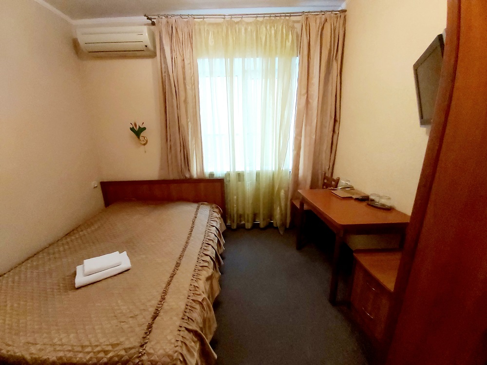В номере: кровать двуспальная, прикроватные тумбочки, стол, стул, шкаф, кондиционер, набор посуды, телевизор, телефон, холодильник