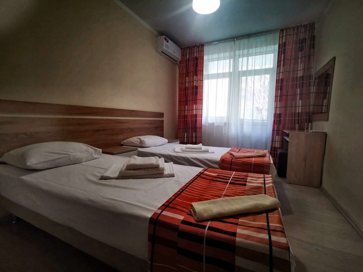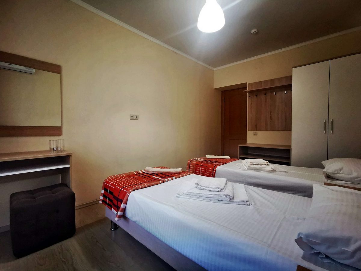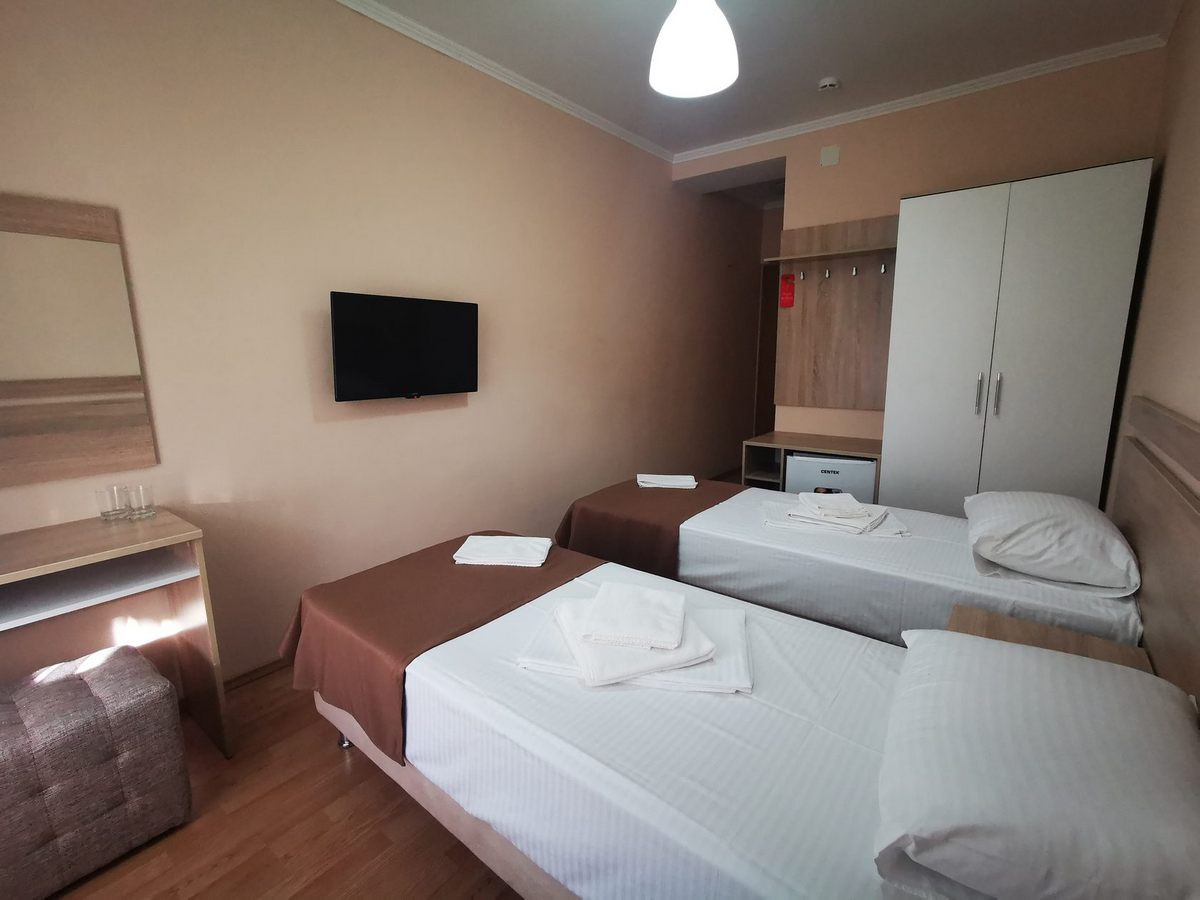 В номере: две односпальные кровати или одна двуспальная, прикроватные тумбы, стол, пуф, шкаф, телевизор, холодильник, кондиционер, стаканы