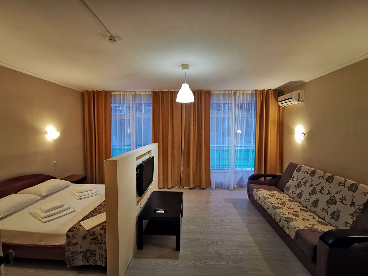 В номере: две односпальные кровати или одна двуспальная, прикроватные тумбы, стол, пуф, малогабаритный диван, шкаф, телевизор, холодильник, кондиционер, стаканы