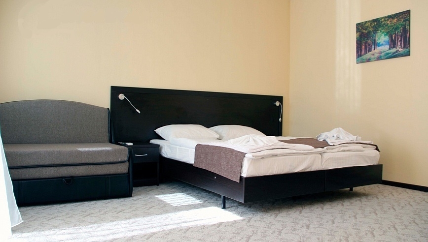 • В номере: душевая кабина, туалет, два ТВ, холодильник, двуспальная и раздельные кровати.